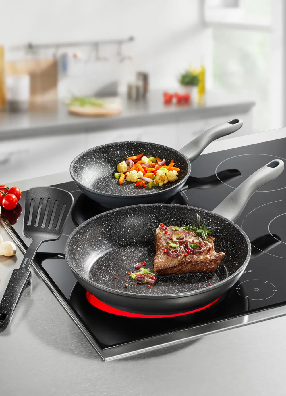 „Stoneline®“ Pfannen-Set mit kratzfester „Stoneline®“-Antihaftbeschichtung mit echten Steinpartikeln. Robust wie Stein, jedoch nicht schwer. Ideal zum fettfreien und gesunden Kochen und Braten. Wertvolle Vitamine und Nährstoffe bleiben erhalten. Bester Geschmack, krosses Fleisch. Kein Anbrennen und Ankleben. Backofengeeignet bis 150 °C.
