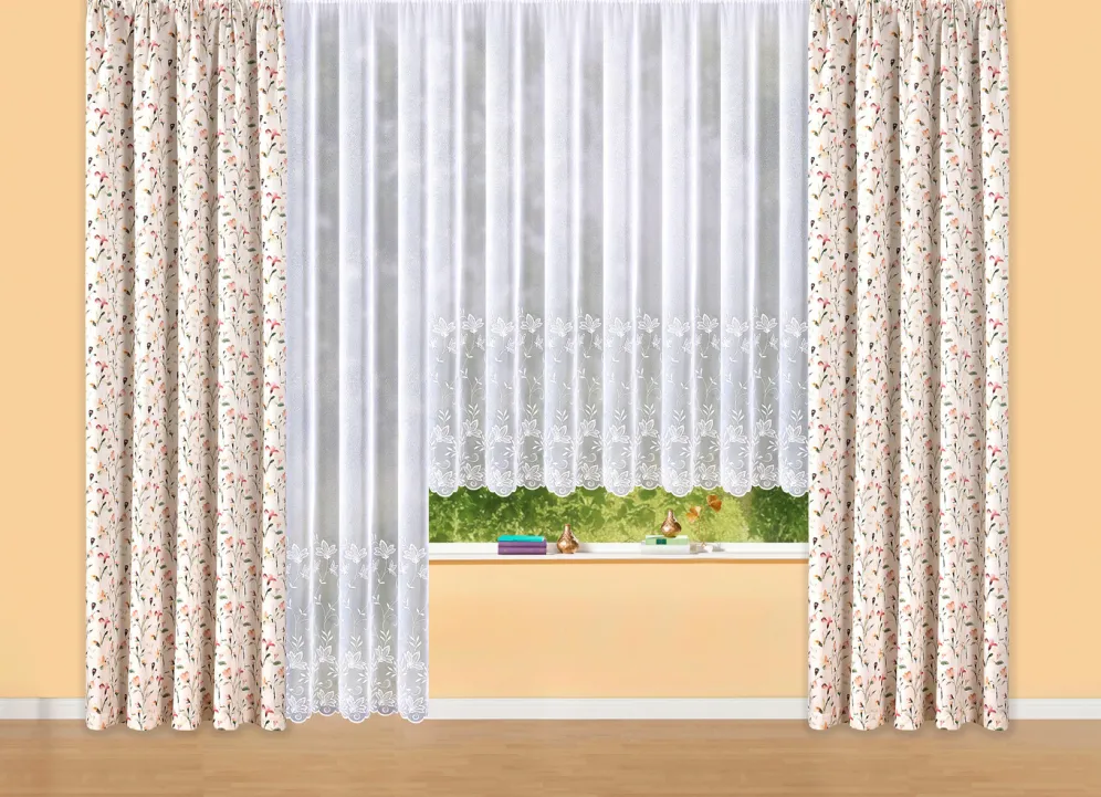Store mit Blätter-Stickerei und Universalschienenband in Größe 160 (H145xB300 cm) und in Weiss.