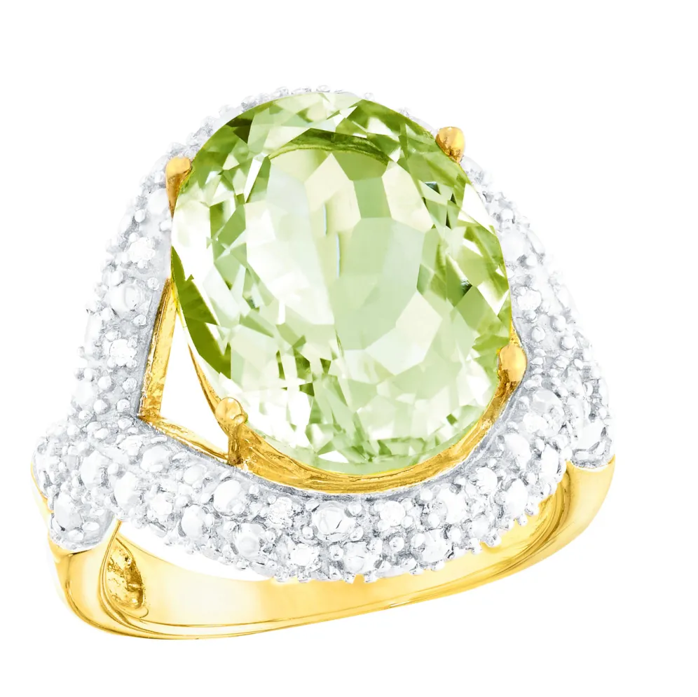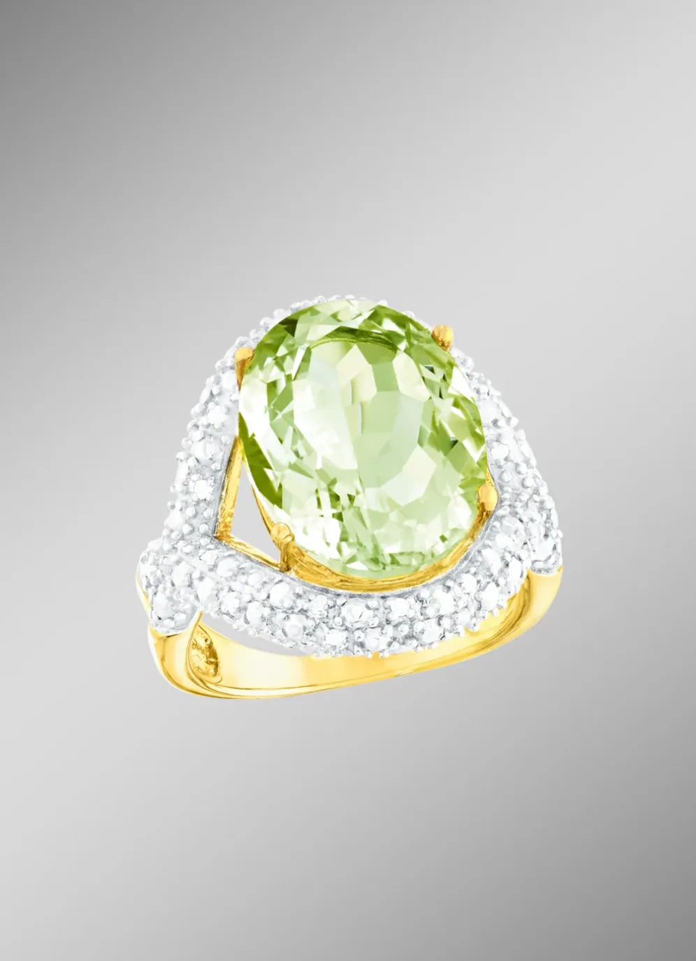 Ein Schmuckstück mit Blickfanggarantie! Dieser hochwertig verarbeitete und reich ausgefasste, vergoldete Damenring aus Silber 925/- fein verleiht Ihrer Ausstrahlung das gewisse Etwas. Der große, echte, grüne Amethyst und die vielen, echten Weißtopase sorgen für funkelnde Augenblicke.