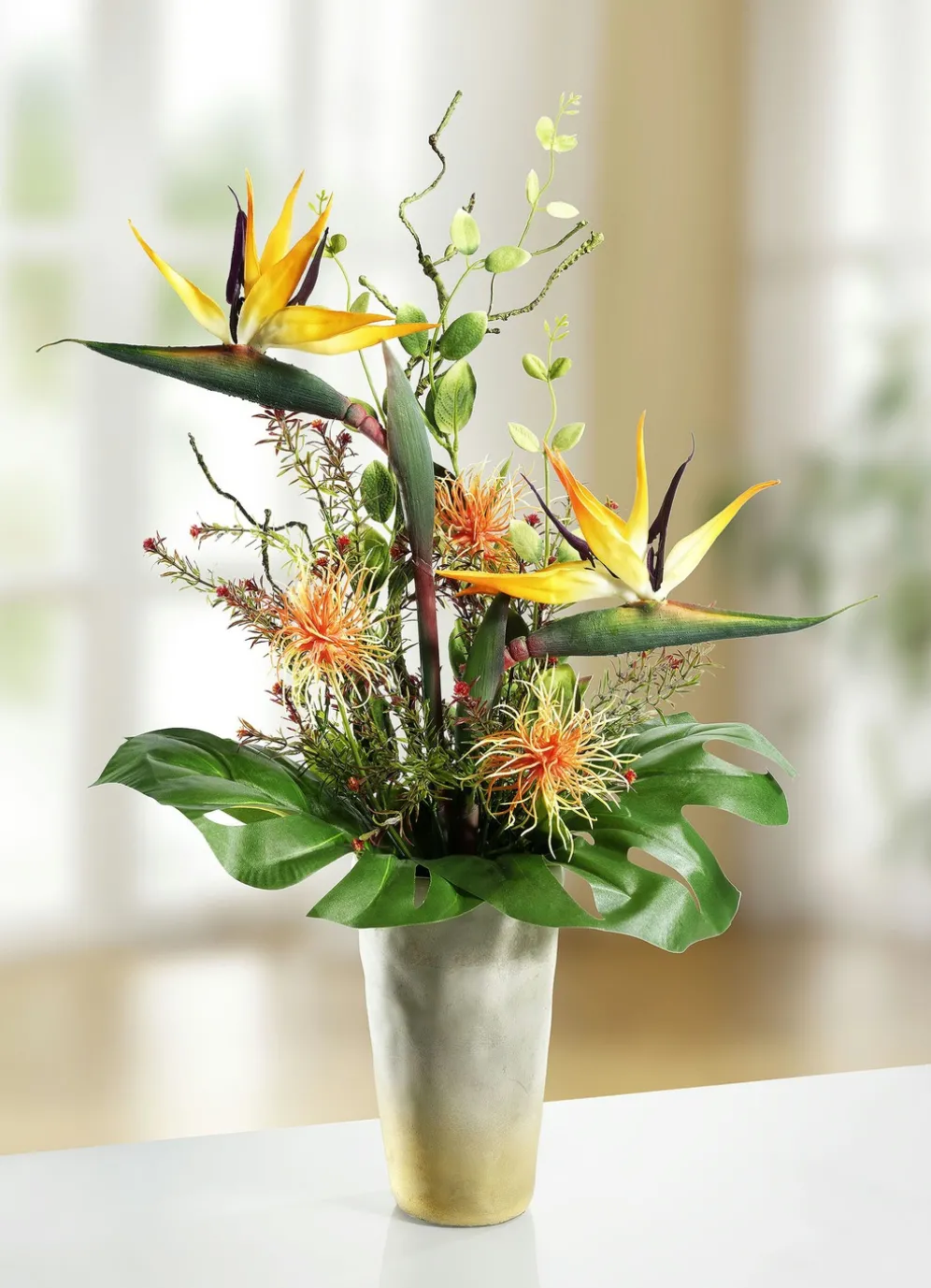Dieser herrliche Blumenstrauß präsentiert sich mit tollen Strelitzien, Spinnen-Protea und passendem grünen Beiwerk. Aus Kunst- und Textilmaterial gefertigt. Fest in eine Vase aus Steingut eingesetzt. Maße: Höhe ca. 60 cm, Topf ø 12,5 cm, Höhe 20 cm.