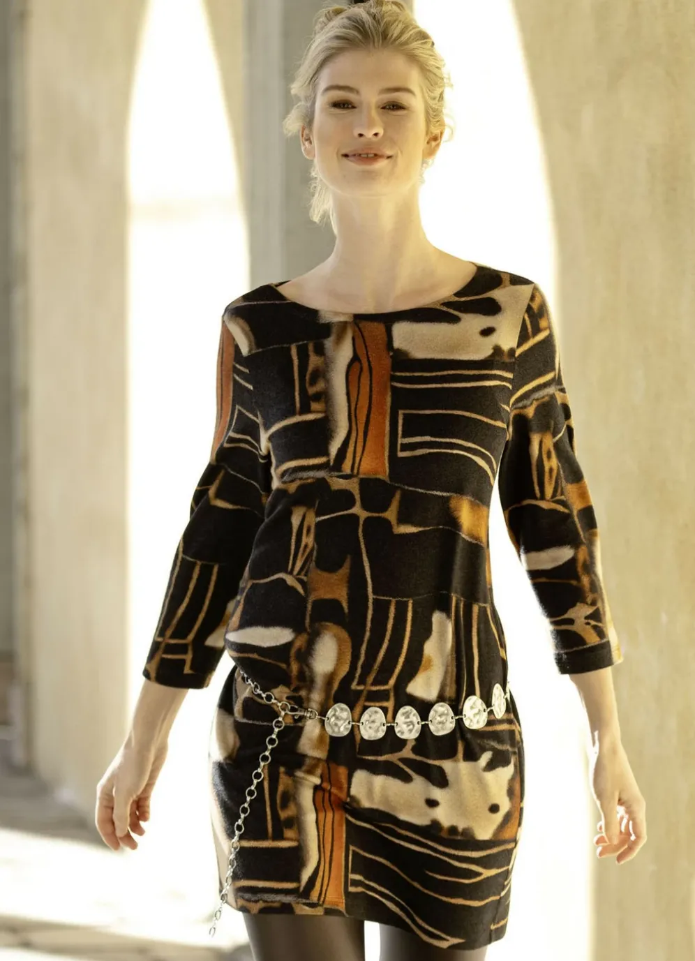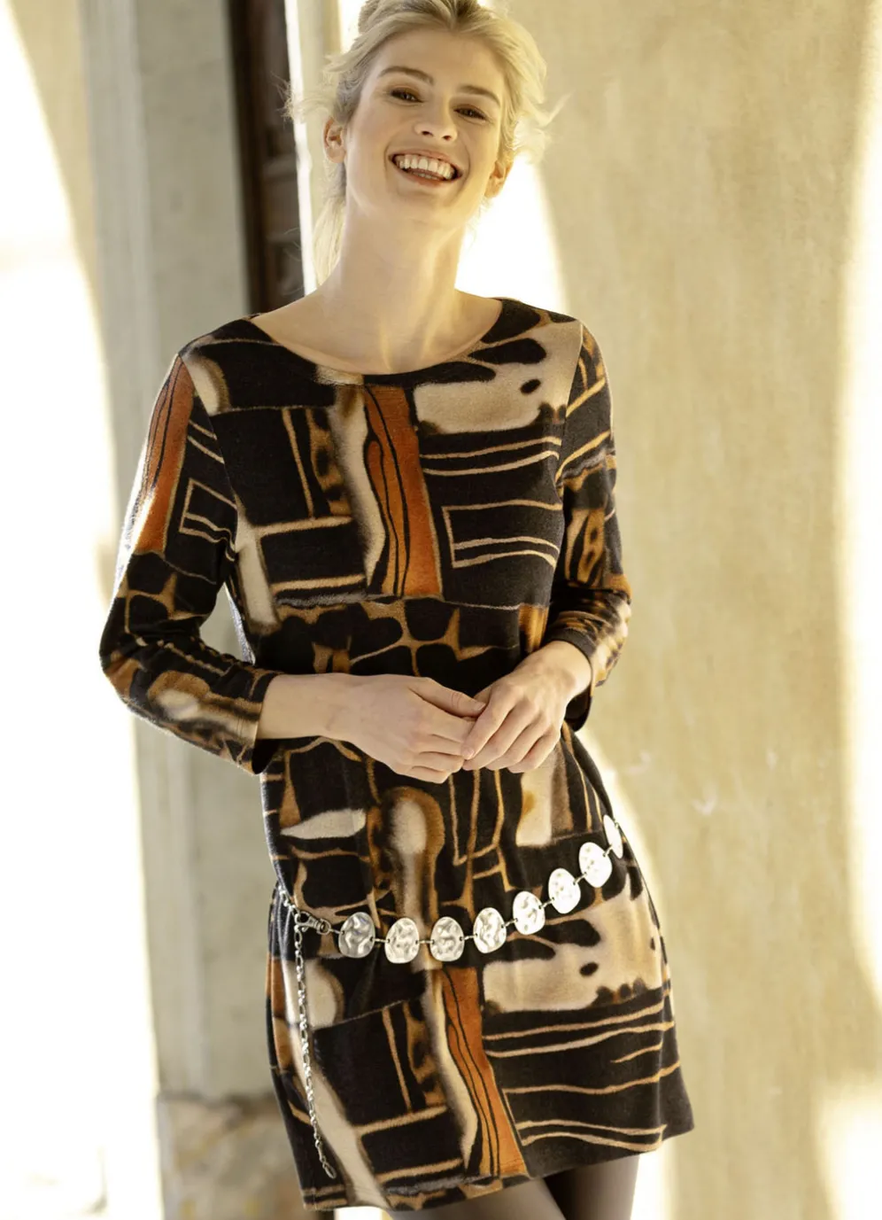 Jedes Teil ein Unikat! Strick-Tunika mit farbbrillantem Druck in Schwarz-Camel-Multicolor allover, weitem, runden Halsausschnitt sowie 3/4-langen Ärmeln.