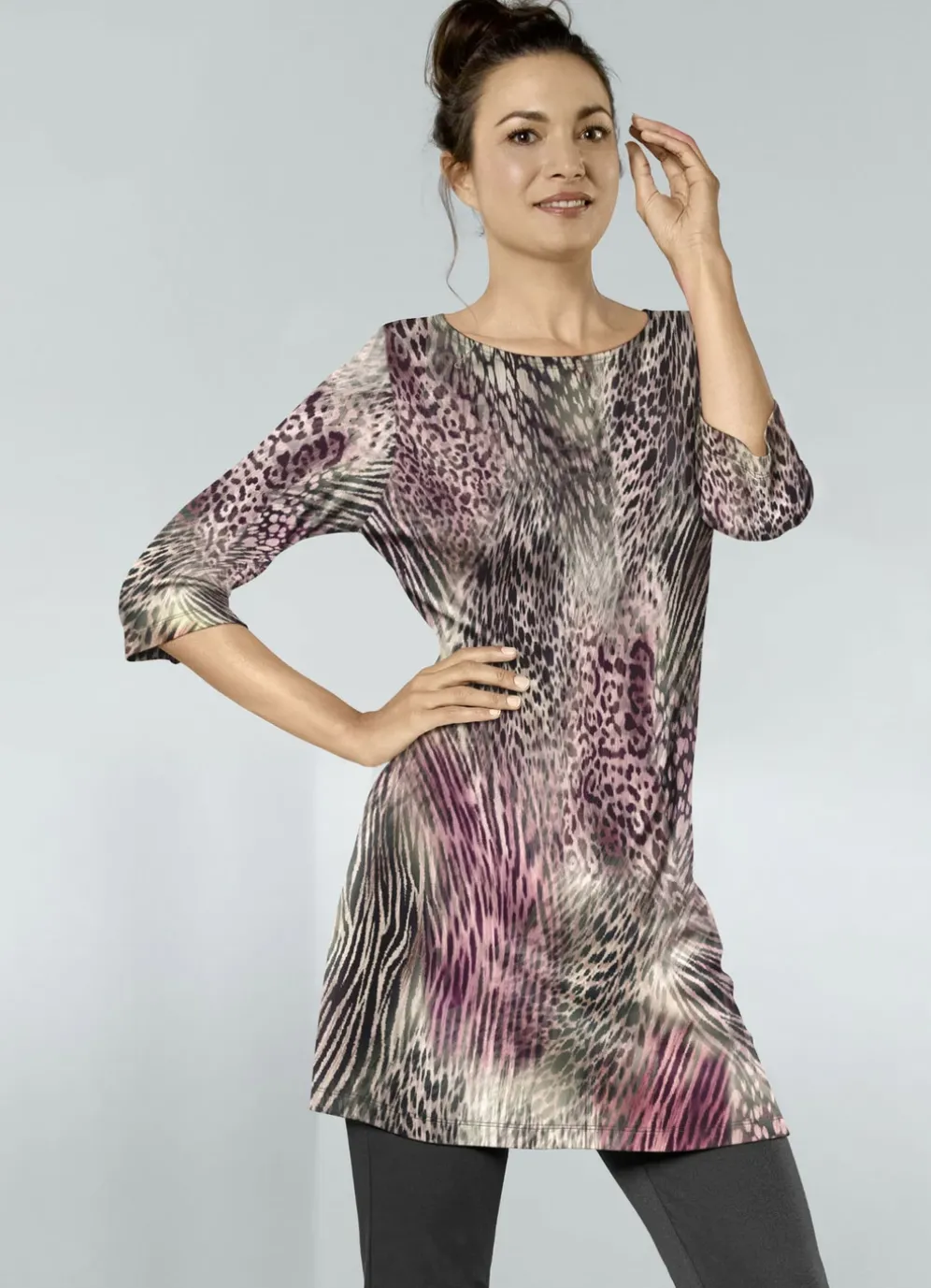 Jedes Teil ein Unikat! Strick-Tunika mit farbbrillantem Druck in rosé-multicolorfarbener Tierfelloptik allover: legere Form, modisch flacher Ausschnitt, 3/4-lange Ärmel.