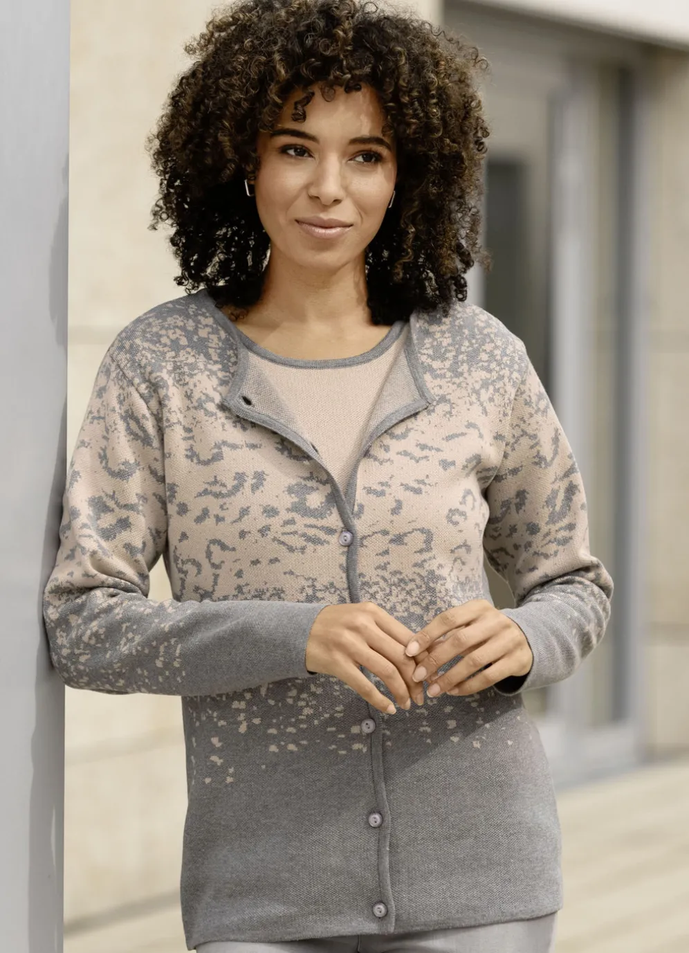 Durchgeknöpfte Strickjacke mit rundem Halsausschnitt, elegantem Dessin allover sowie langen Ärmeln;