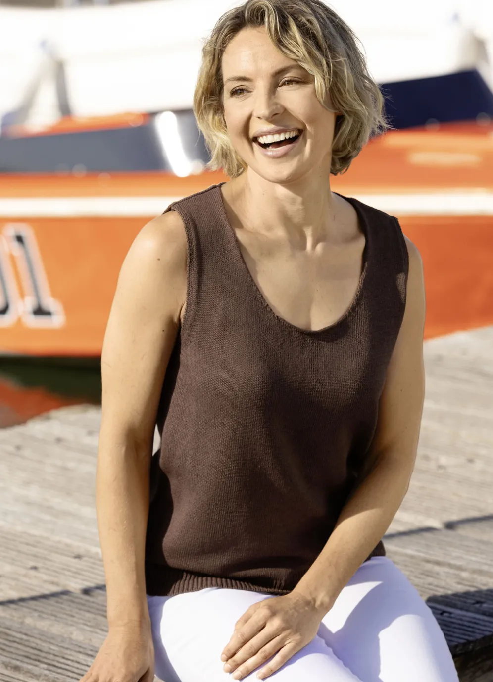 Stricktop: runder Halsausschnitt, ärmellos, Rippensaum.