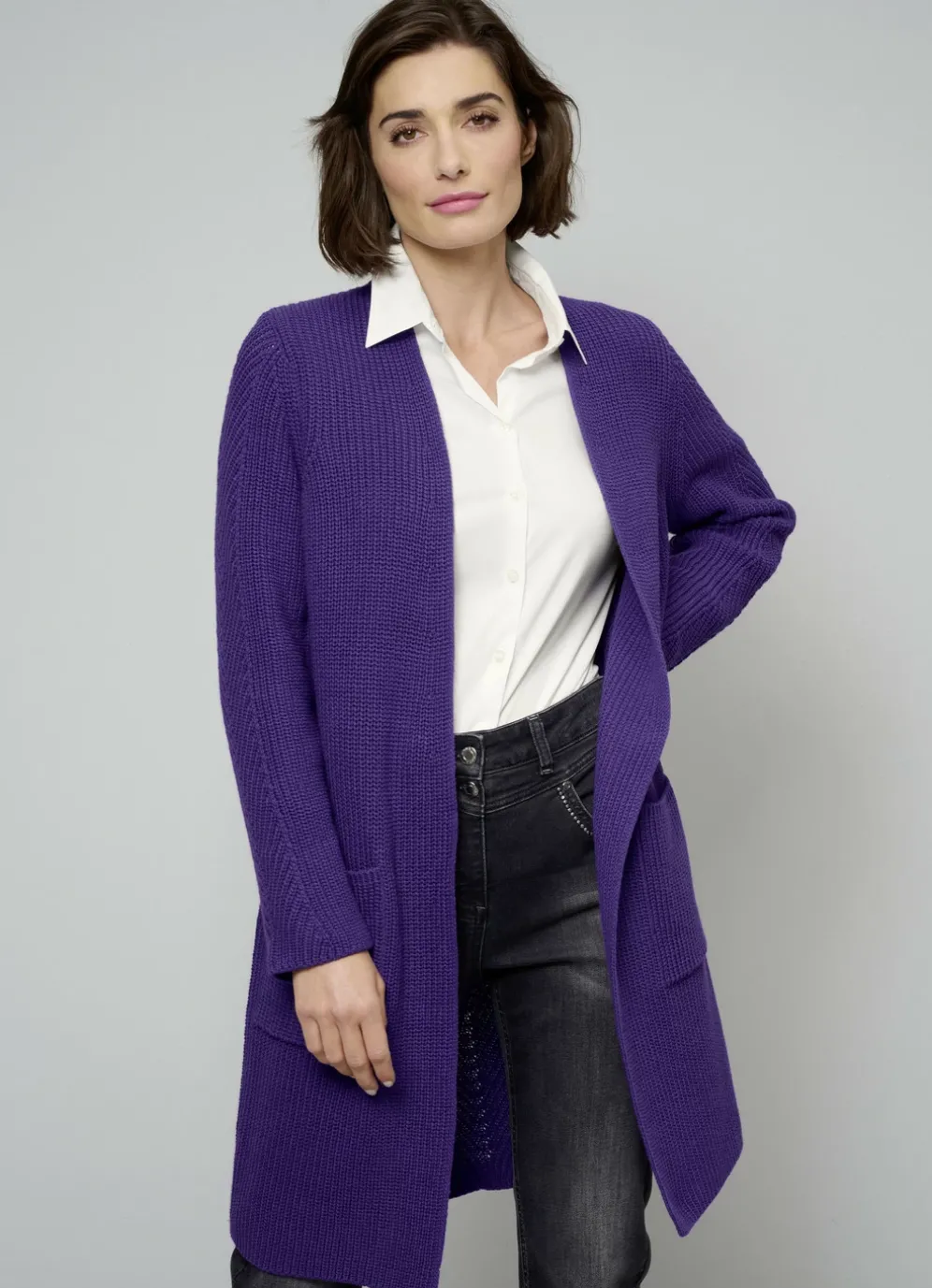 Strickjacke: verschlusslos, Longform, Vorderteil-Mitte und auf den langen Ärmeln diagonal zulaufende Struktur, 2 aufgesetzte Taschen.