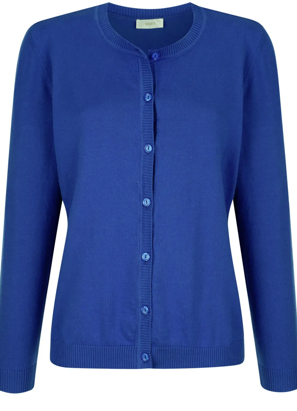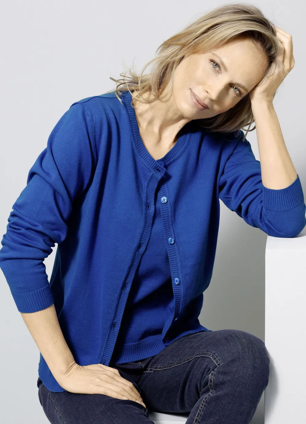 Strickjacke aus reiner Baumwolle in Royalblau und in Größe 38.