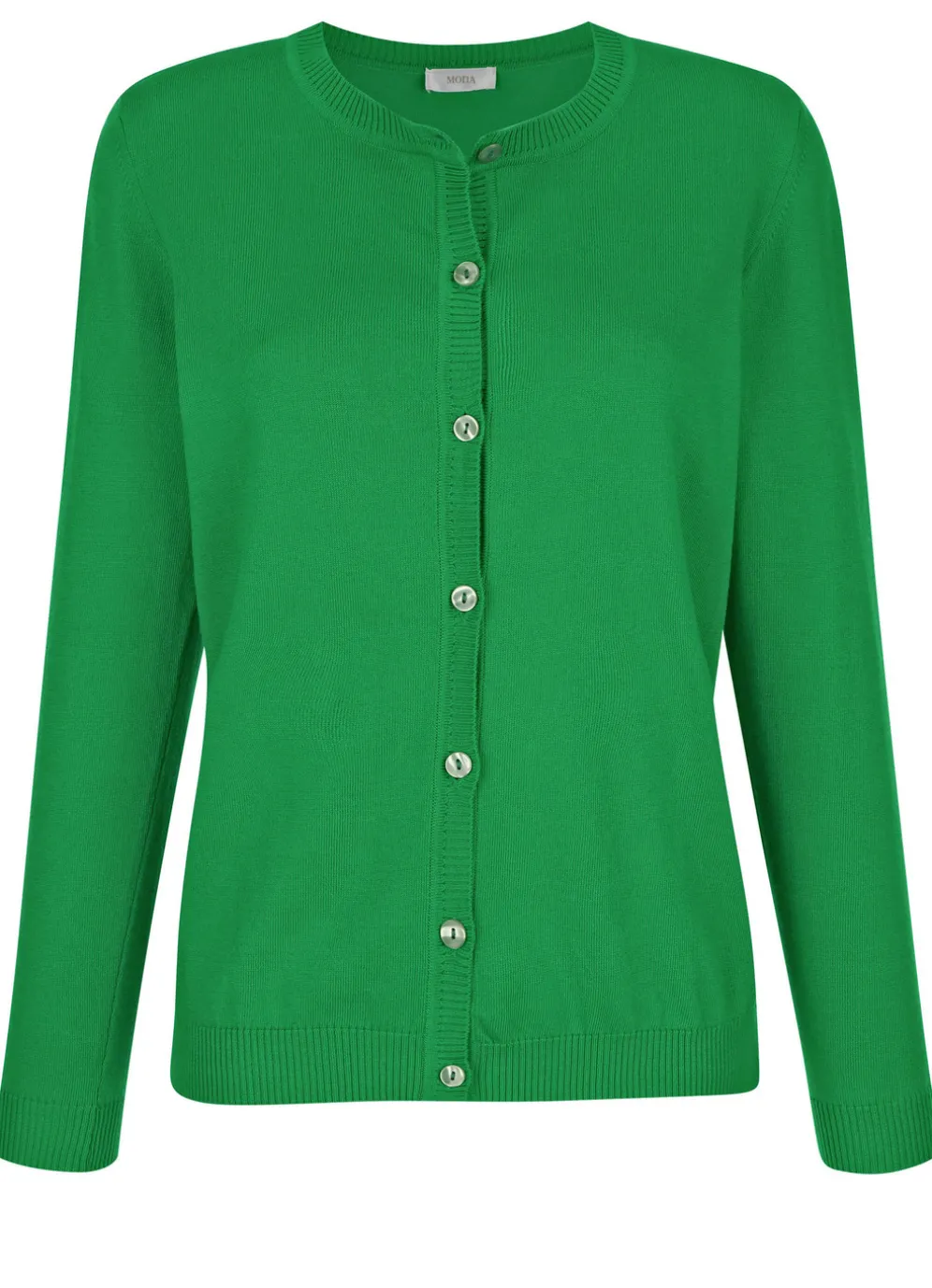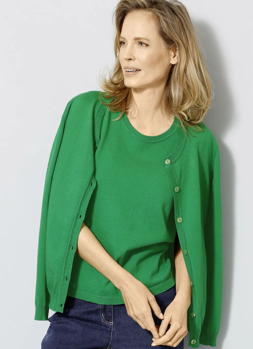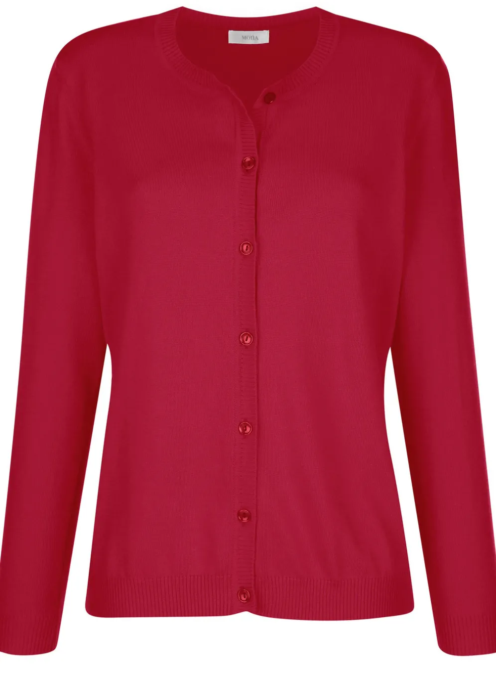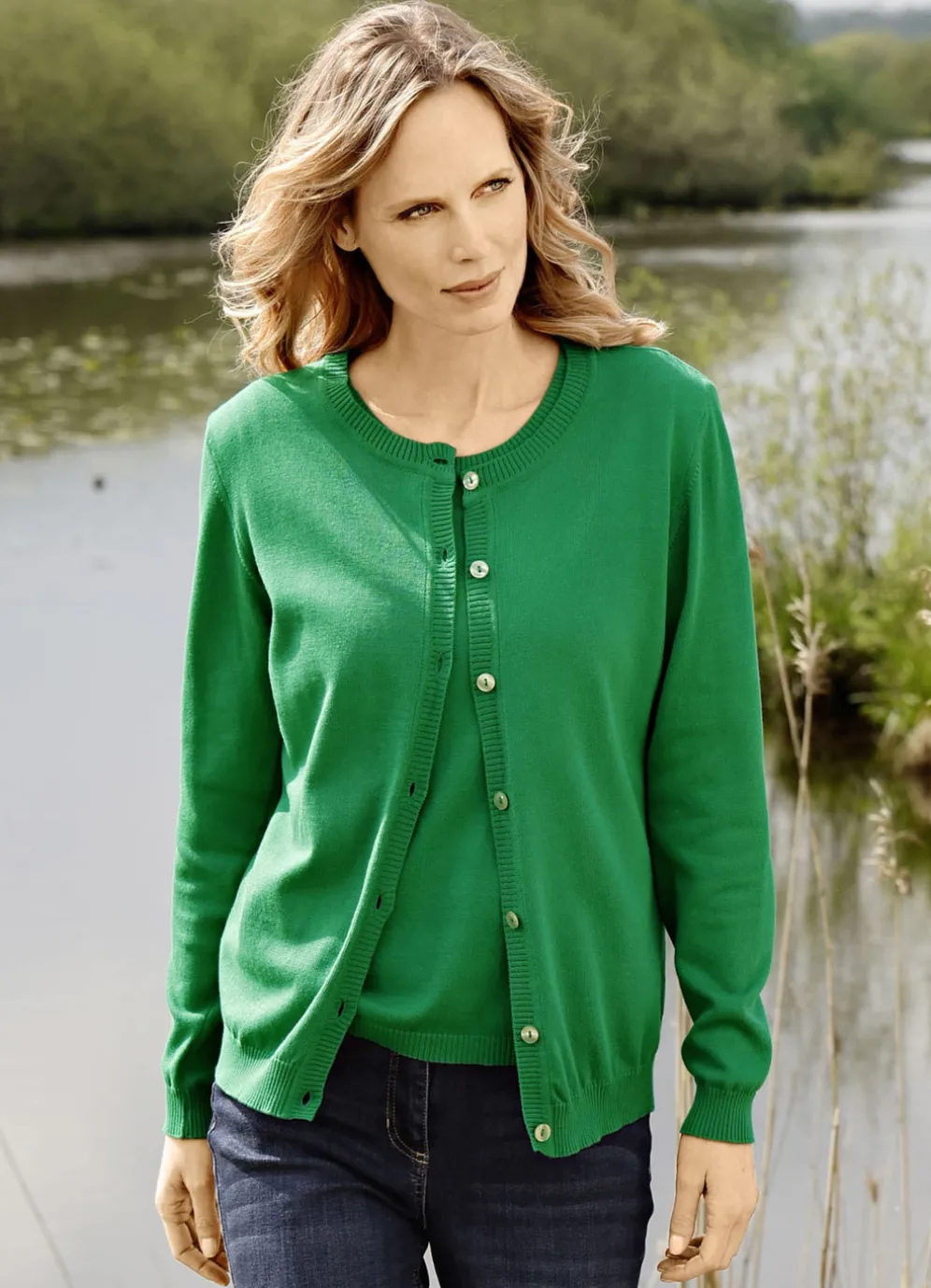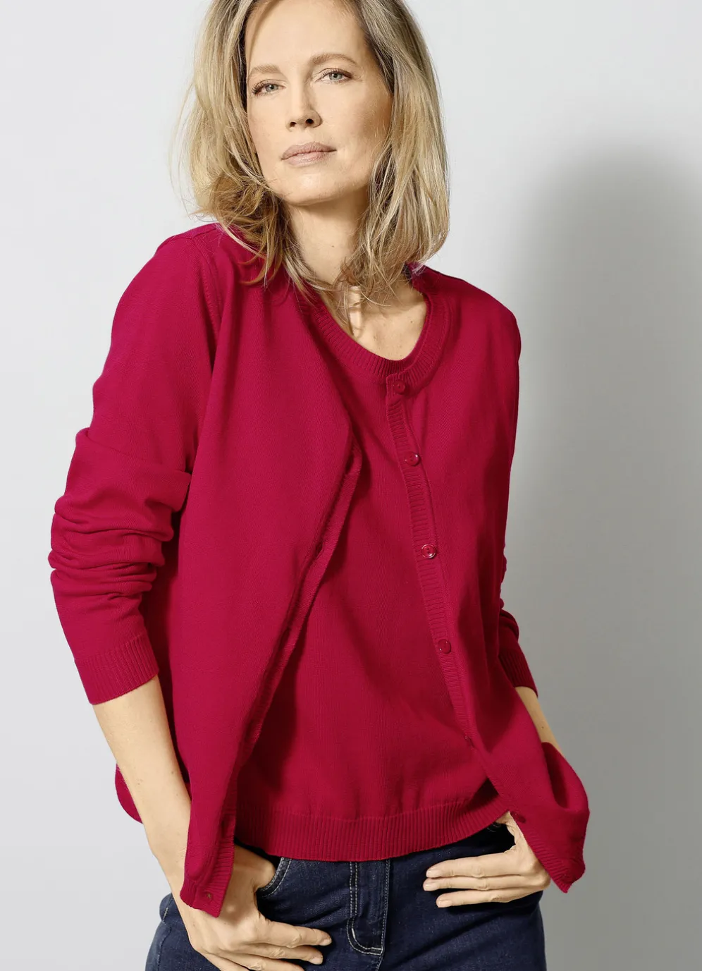 Aparte Strickjacke in durchgeknöpfter, leicht taillierter Form, mit rundem Halsausschnitt sowie Rippenbündchen an den langen Ärmeln.