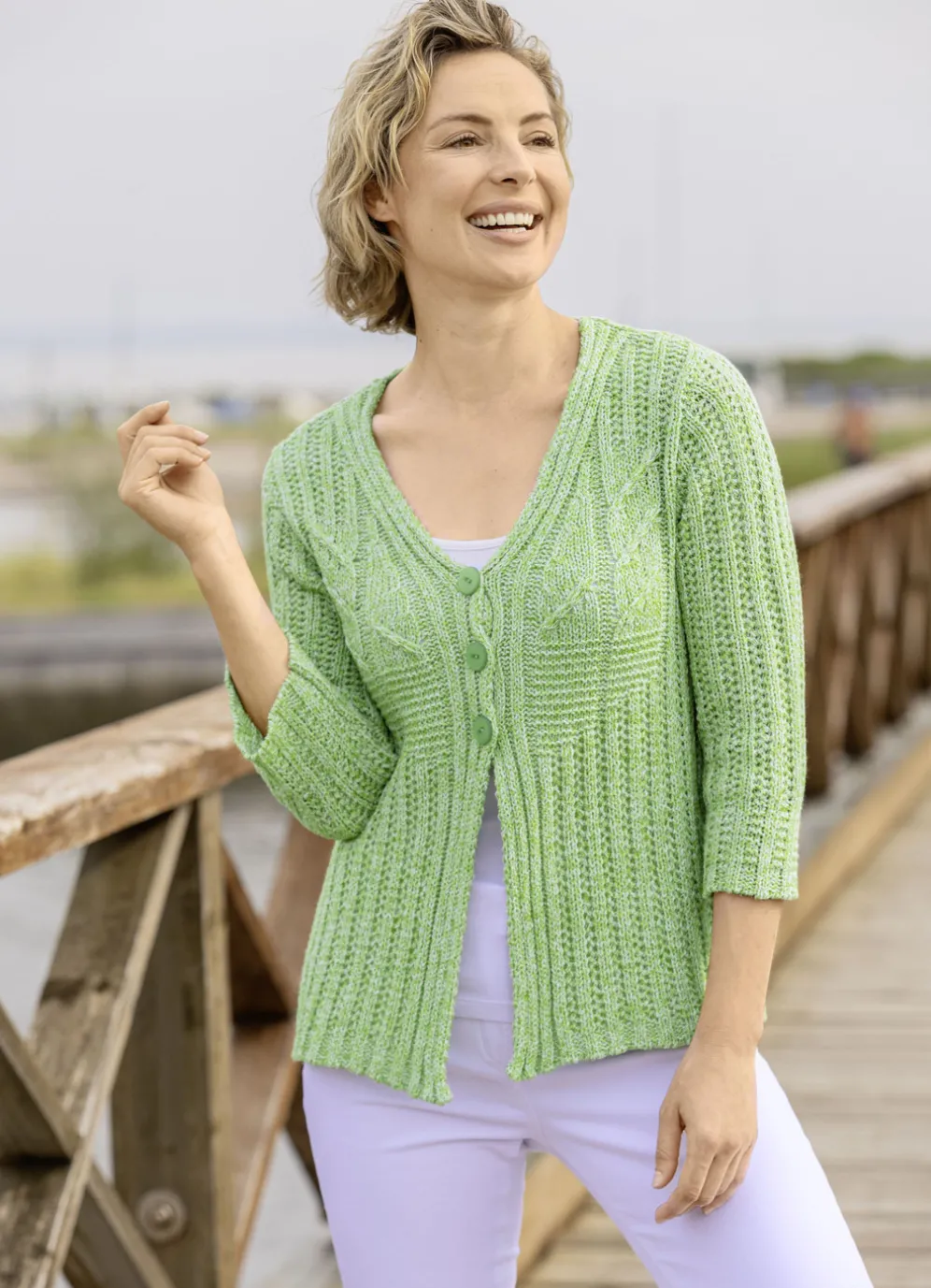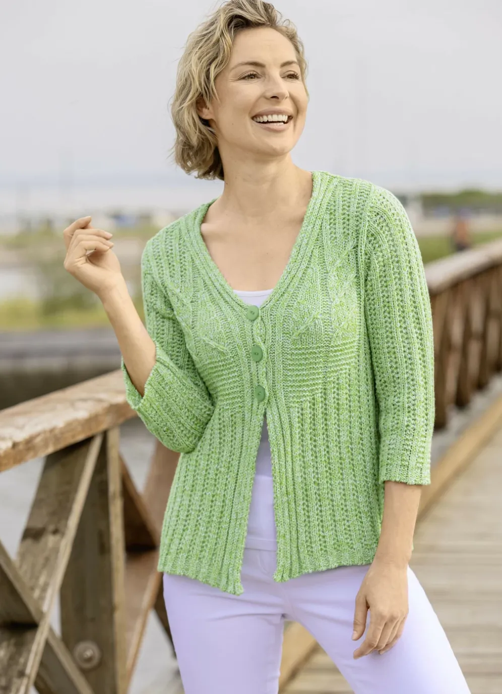 Strickkunst vom Feinsten ist diese Strickjacke in Limette meliert, mit hübschem Strukturmuster und feiner Melangeoptik allover, abgerundetem V-Ausschnitt, Ärmeln in modischer Länge sowie drei Knöpfen zum Verschließen.