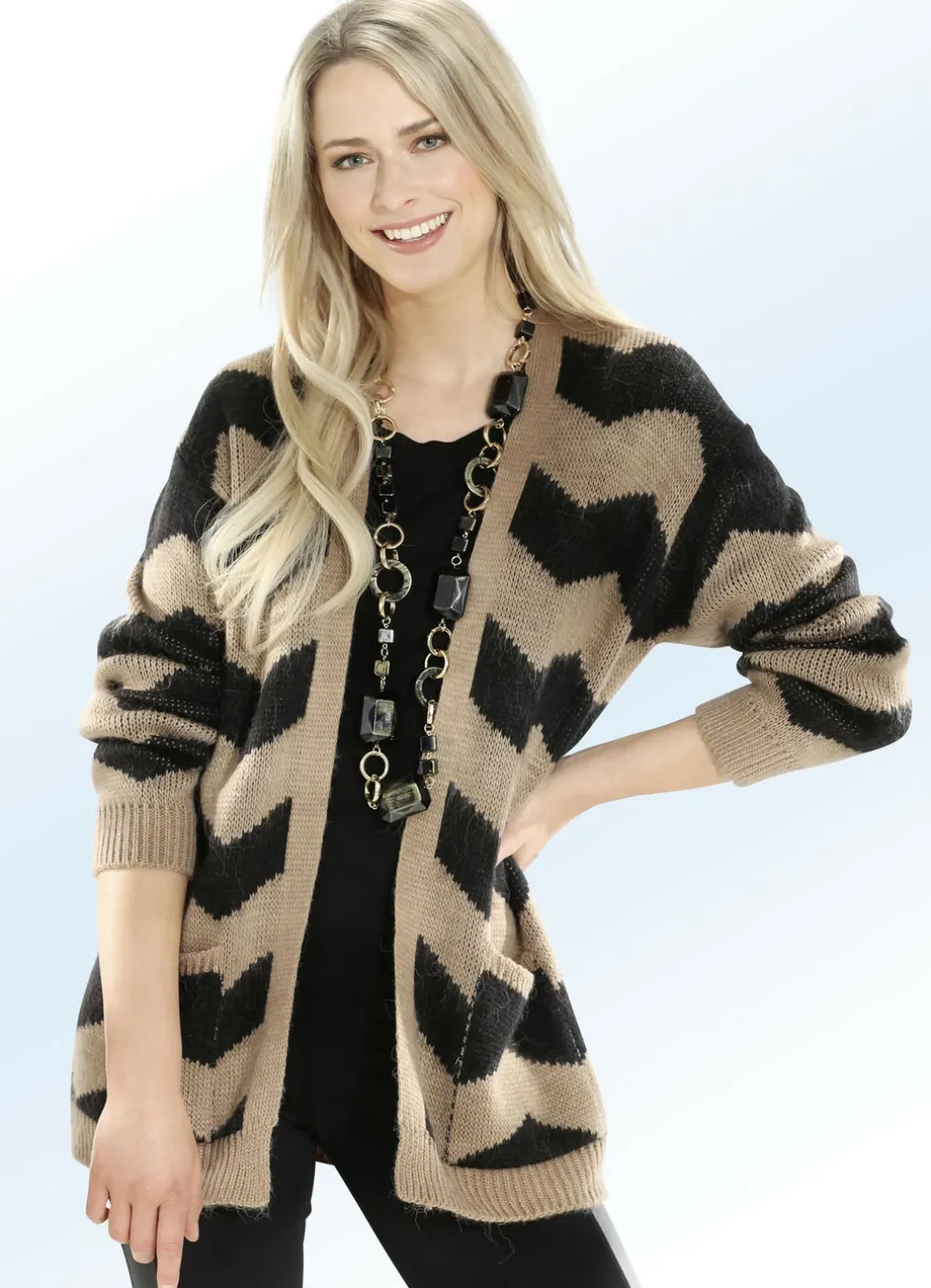 Stylische, verschlusslose Strickjacke mit Jacquard-Zackendessin in Camel-Schwarz allover, V-Ausschnitt, zwei aufgesetzten Taschen sowie langen Ärmeln.