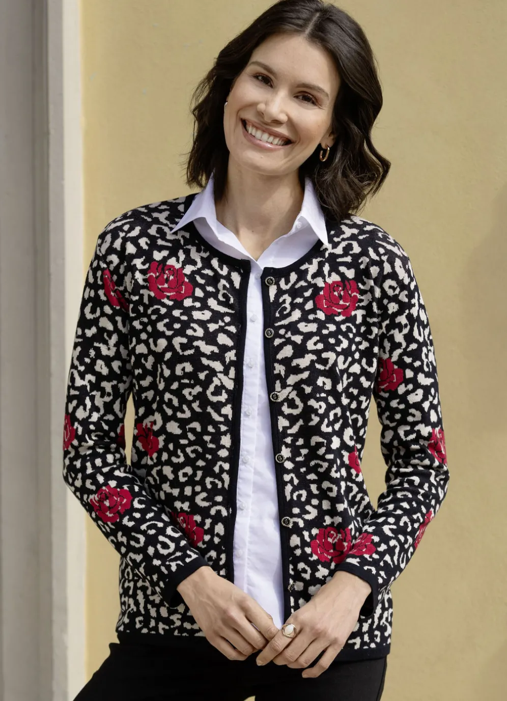 Durchgeknöpfte Strickjacke mit Allovermuster in Tierfell- und Blütendessin in Schwarz-Beige-Rot, rundem Halsausschnitt sowie langen Ärmeln.