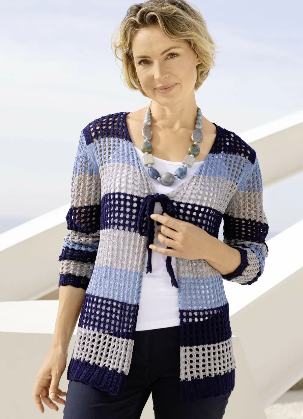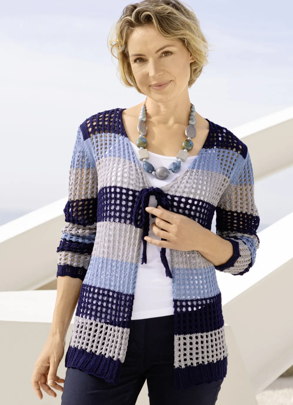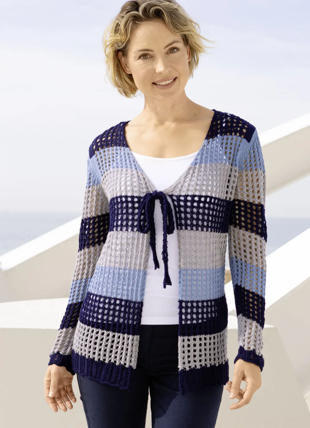 Außergewöhnliche Strickjacke in Marine-Bleu-Grau, mit dezentem Glanz, V-Ausschnitt mit Bindebändchen, Ajourmuster in Blockstreifendessin rundum sowie gewellten Abschlüssen an den langen Ärmeln und am Saum.