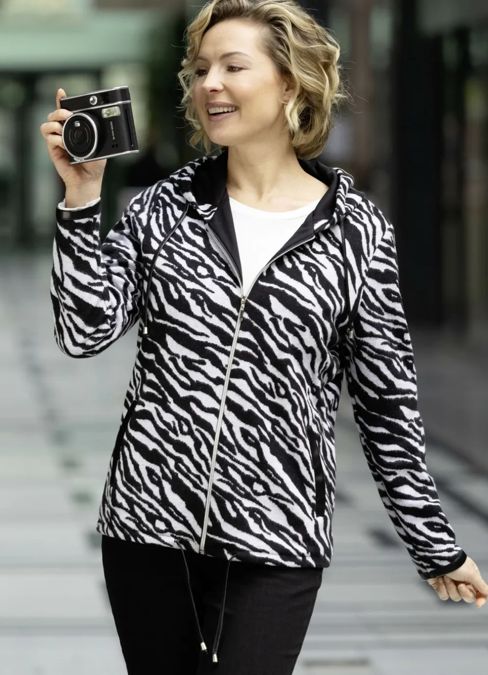 Faszinierende, gefütterte Strickjacke in schwarz-weißem Tierfelldessin allover: Kordelzug an Kapuze und Saum, durchgehender Reißverschluss, Nappaleder-Imitatbesätze an den Abschlüssen der langen Ärmel und den gefütterten Taschen.