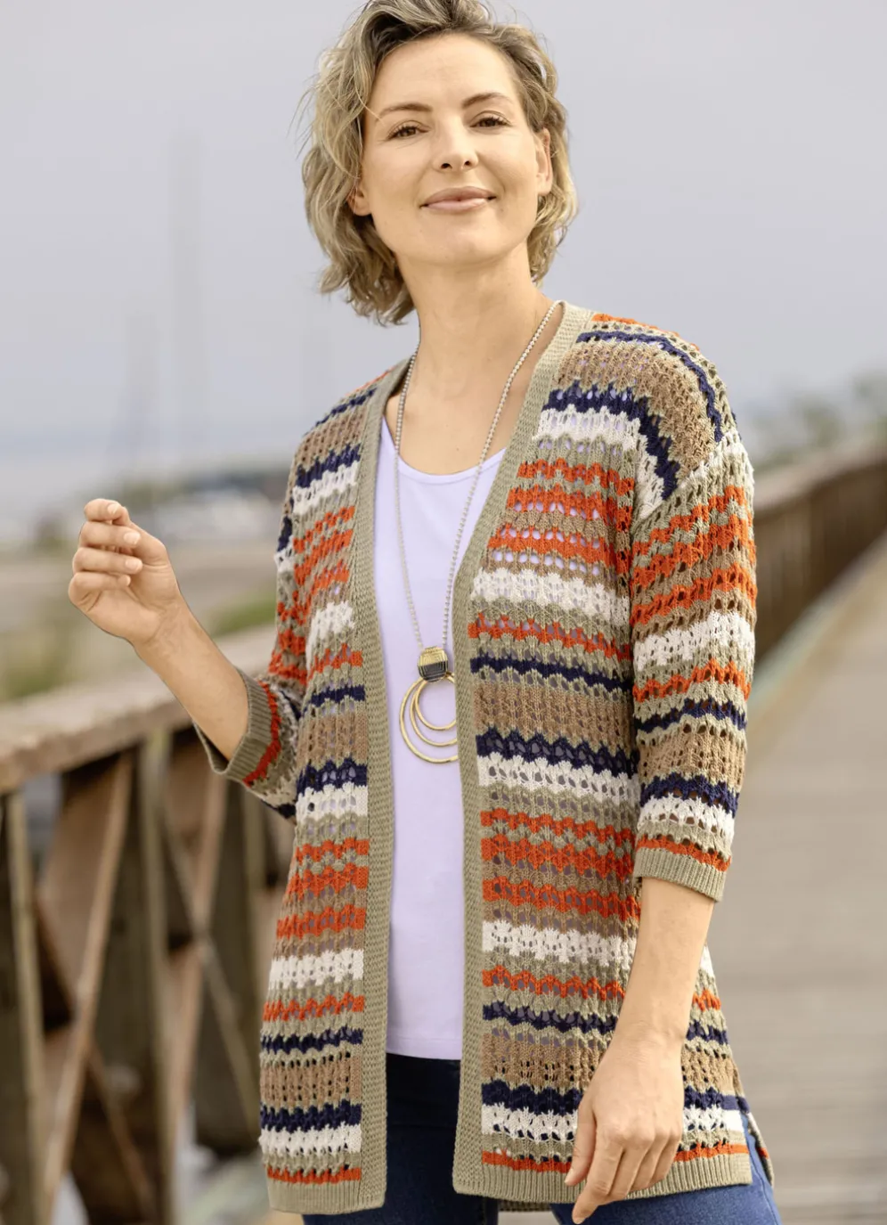 Lässige, verschlusslose Strickjacke in Oliv-Orange-Multicolor, mit hübschem Ajourmuster in Streifenoptik allover, V-Ausschnitt, überschnittener Schulterpartie, 3/4-langen Ärmeln, Seitenschlitzen sowie gerippten Abschlüssen.