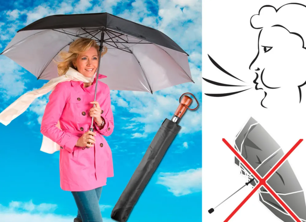 Dieser Regenschirn hält jedem Wetter stand. Luftschlitze in der doppelten Bespannung lassen den Wind aus dem Schirm entweichen und verhindern so ein Umklappen. Stabiles Gestänge. Extra-großer Schirm (Durchmesser 130 cm). Groß genug für zwei Personen.