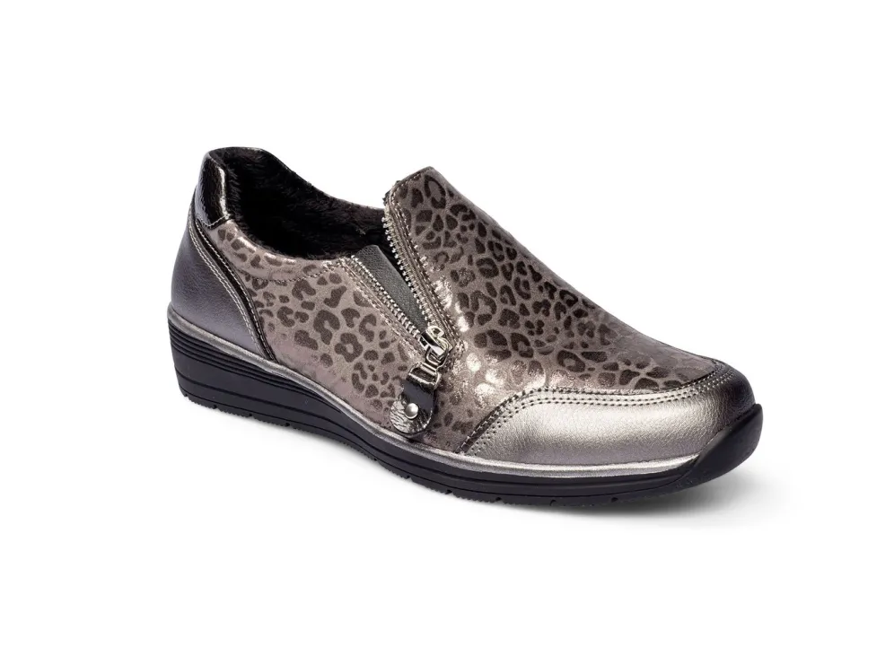 Bequem, leicht und warm gefütterter Halbschuh im angesagten Leo-Look. Außenseite mit Reißverschluss und innen mit elastischem Einsatz für einen einfachen Ein-und Ausstieg. Die herausnehmbare Soft-Touch-Sohle sorgt für einen angenehmen Tragekomfort. Rutschhemmende TPR-Laufsohle mit 30-mm Keilabsatz. Qualität: Obermaterial, Futter und Decksohle aus Polyester. Gr. 36-42