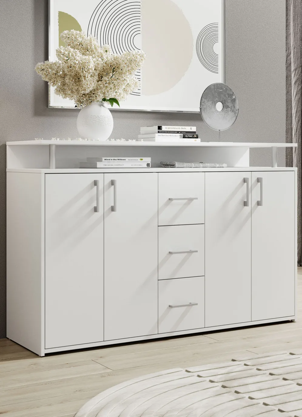 Setzen Sie mit diesem tollen Highboard mit Melaminbeschichtung ein stilsicheres Highlight in Ihrem Wohnraum! Mit 1 breiten, offenen Fach unter der Deckplatte, 4 Türen, dahinter links und rechts 1 Einlegeboden sowie 3 Schubladen auf Kugelauszügen. Mit Bügelgriffen aus Kunststoff. Auf runden Kunststoff-Möbelgleitern. Maße: B139xH90xT34 cm. Mit Aufbau-Anleitung.