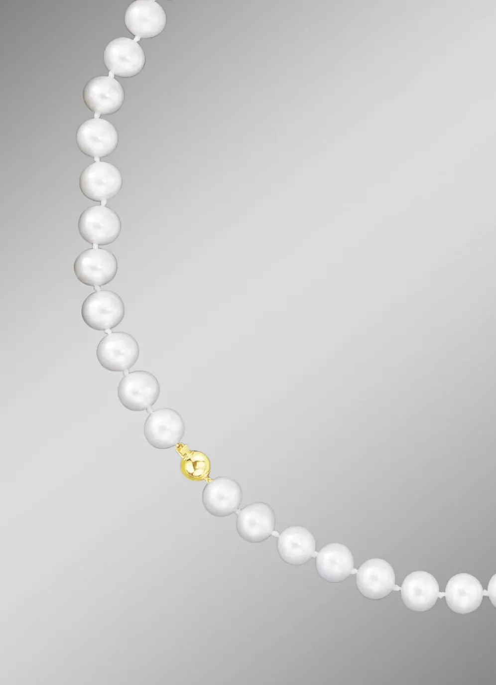 Süßwasser-Zuchtperlkette mit Kugelschließe in der Länge von 45 cm und in der Legierung Gold 585/- fein.