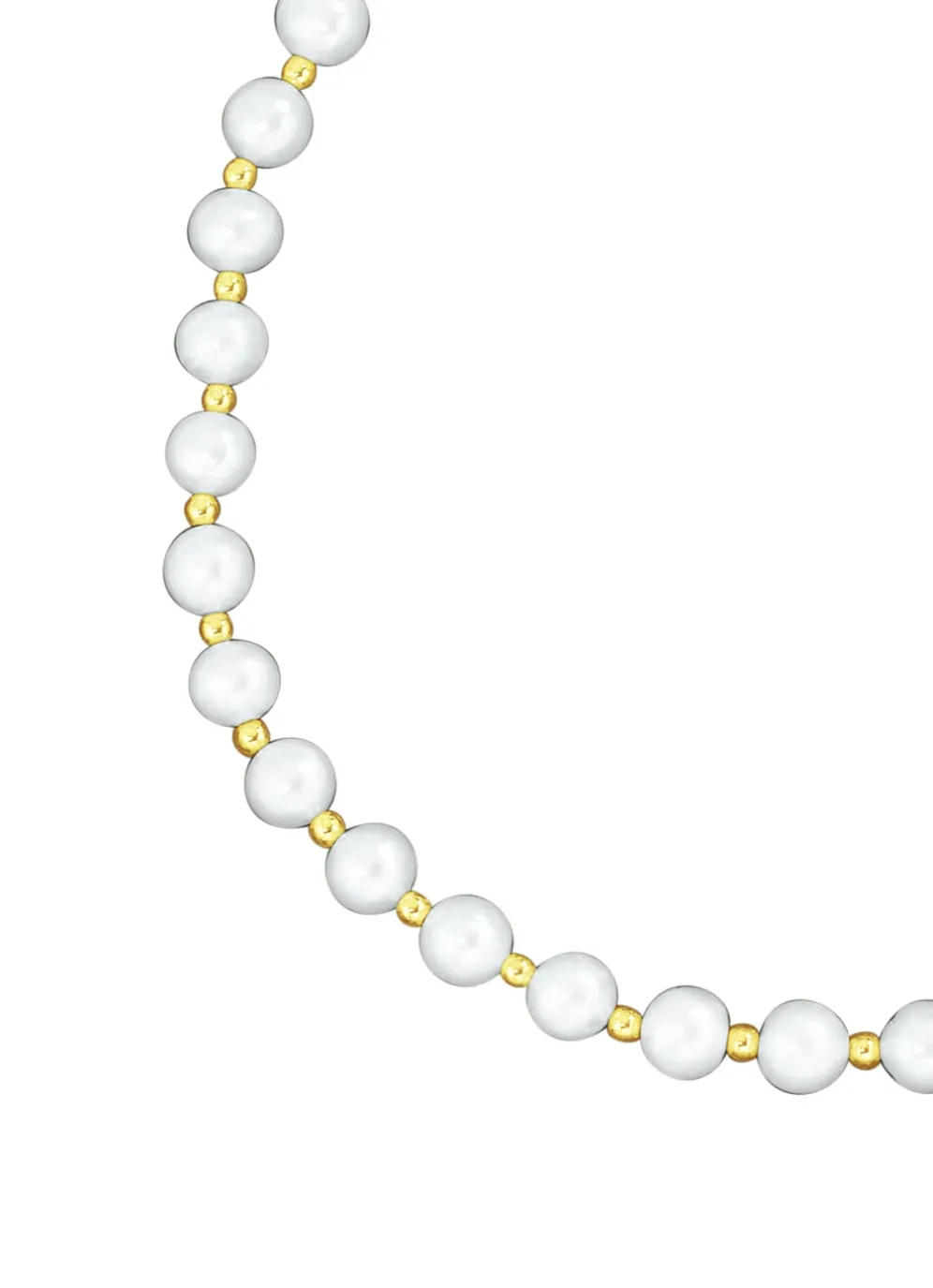 Zauberhaft reihen sich schimmernde Süßwasser-Zuchtperlen, mit einem Durchmesser von 8 mm und Goldteile in Gold 585/- fein, aneinander. Als Verschluss ist ein Karabiner angebracht.