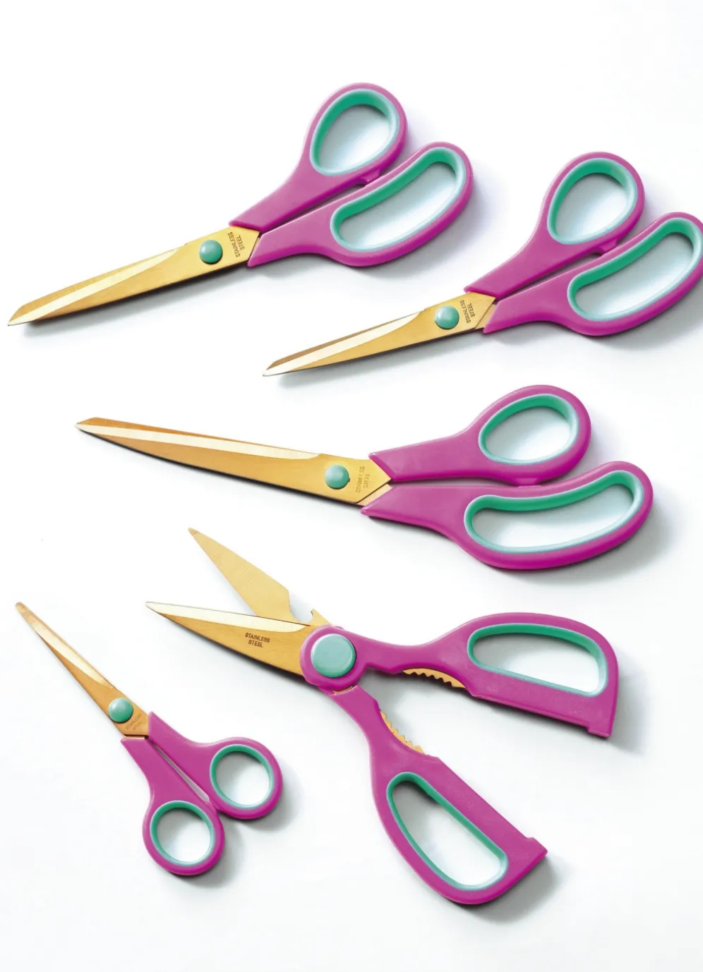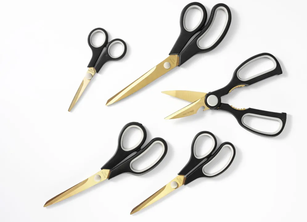 Immer griffbereit: passende Scheren für unterschiedliche Anwendungen. Mit Titanbeschichtung – dadurch besonders robust. Set bestehend aus: Handarbeitsschere, Papierschere, Haushaltsschere, Universalschere und Multischere (mit Flaschenöffner für Kronkorken und Schraubverschlüsse)