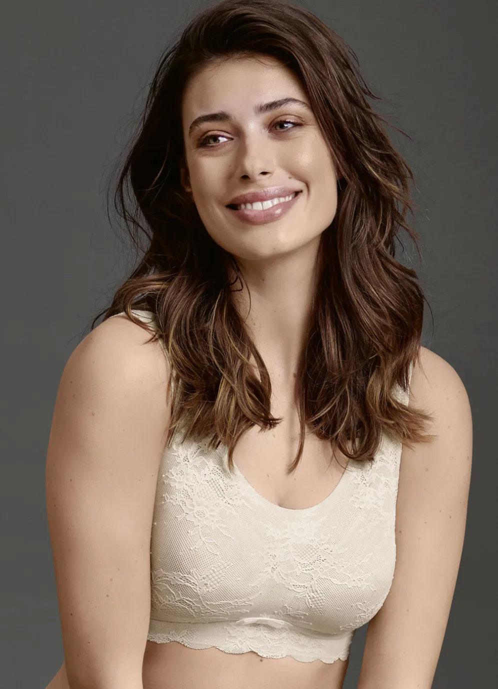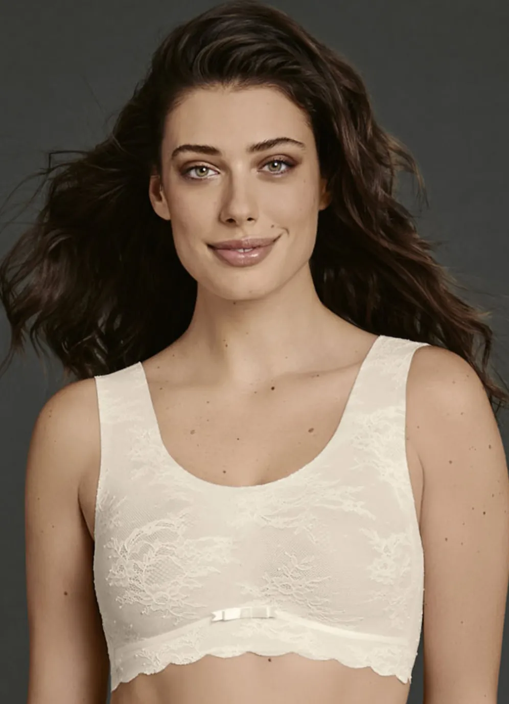 Nahtlos und superbequem: „Anita“-BH aus unterlegter Elastikspitze, mit weichen, herausnehmbaren Pads in den vorgeformten Cups sowie extrabreiten Trägern.