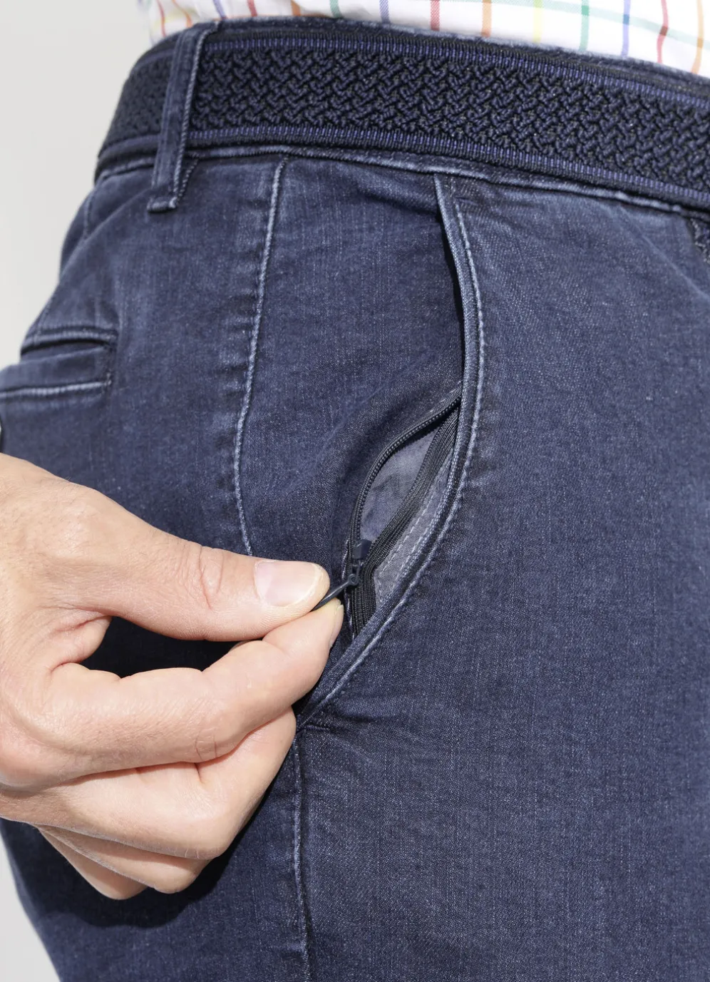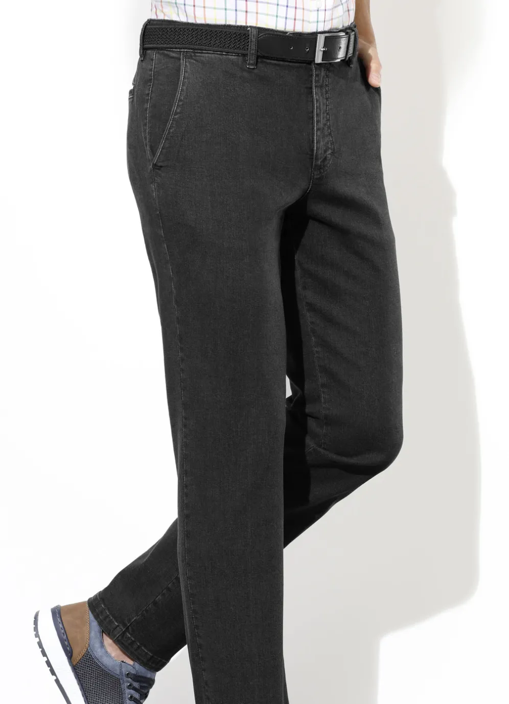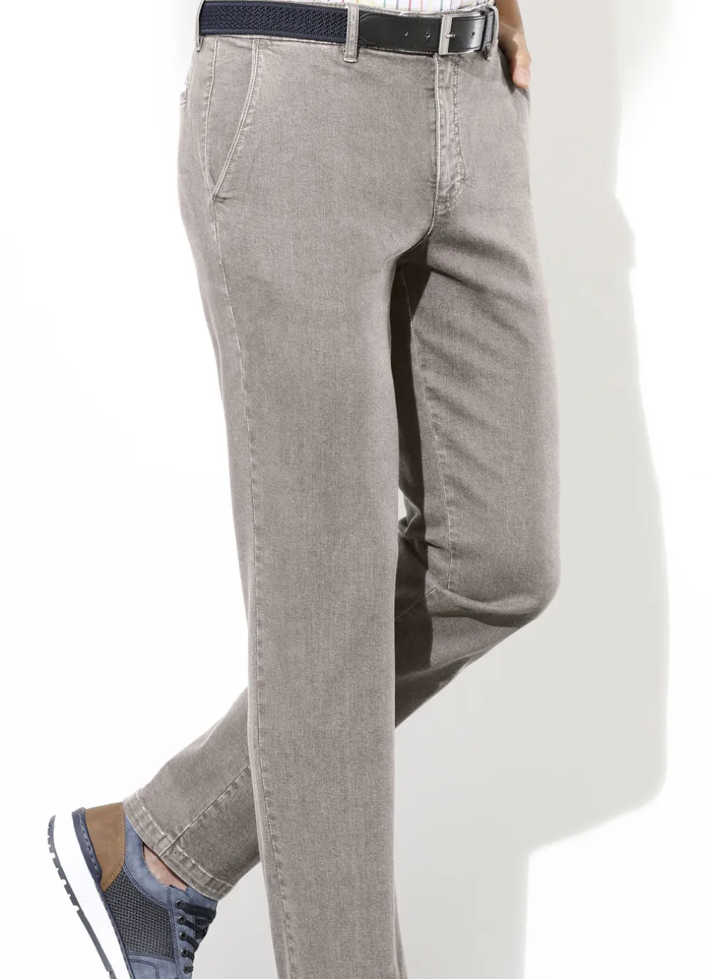 Legere Superstretch-Jeans von „Suprax” mit Dehnbund, Bundübertritt, Seitentaschen, in der rechten Seitentasche zusätzliche Sicherheitstasche mit Reißverschluss, Gesäßpaspeltaschen mit Knopfverschluss sowie Stoffgürtel.