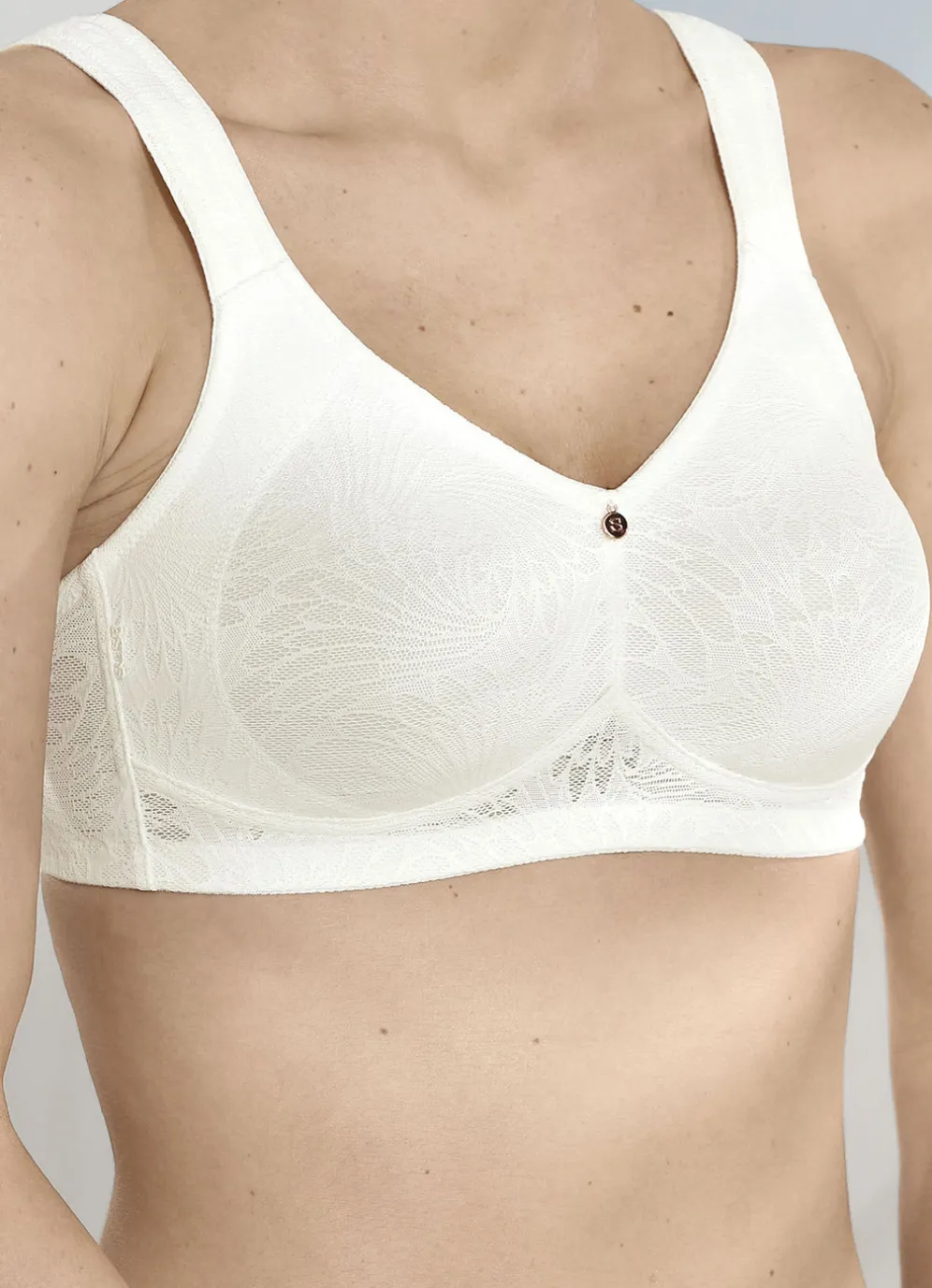Schwarzer „Susa“-BH aus puderfarben unterlegter Elastikspitze, mit vorgeformten Cups, seitlicher, verstärkter Blende sowie im Schulterbereich weich gepolsterten, verstellbaren Stretchträgern.