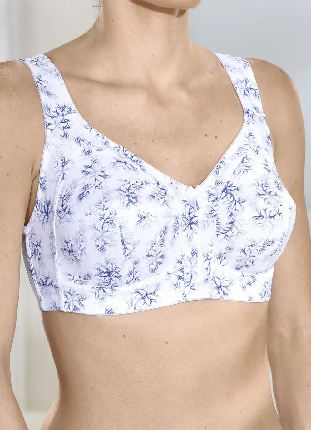 „Susa”-BH in Weiß, mit blauem Floraldessin, unterlegtem Vorderteil, seitlichen Stützstäbchen, verstärktem Rückteil sowie verstellbaren Stretchträgern.
