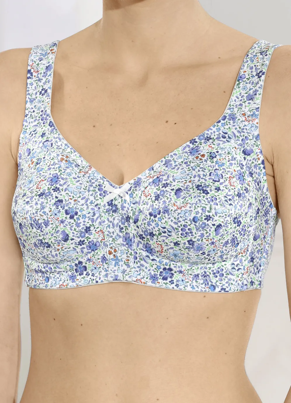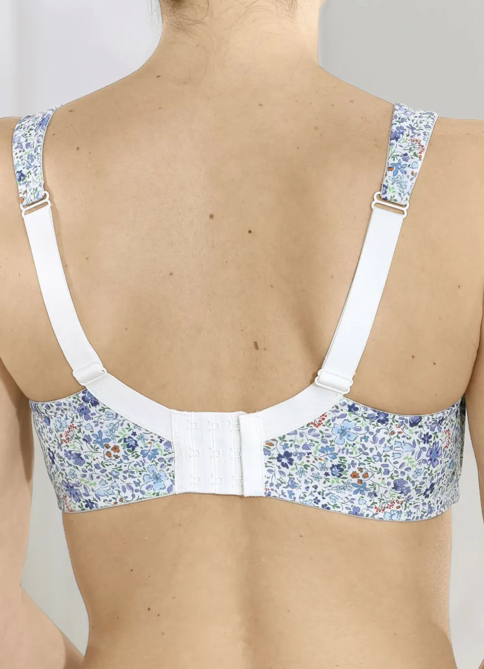Weißgrundiger „Susa”-BH mit farbharmonischem Blümchendessin, unterlegtem Vorderteil, seitlichen Stützstäbchen, verstärktem Rückteil sowie breiten, verstellbaren Stretchträgern.
