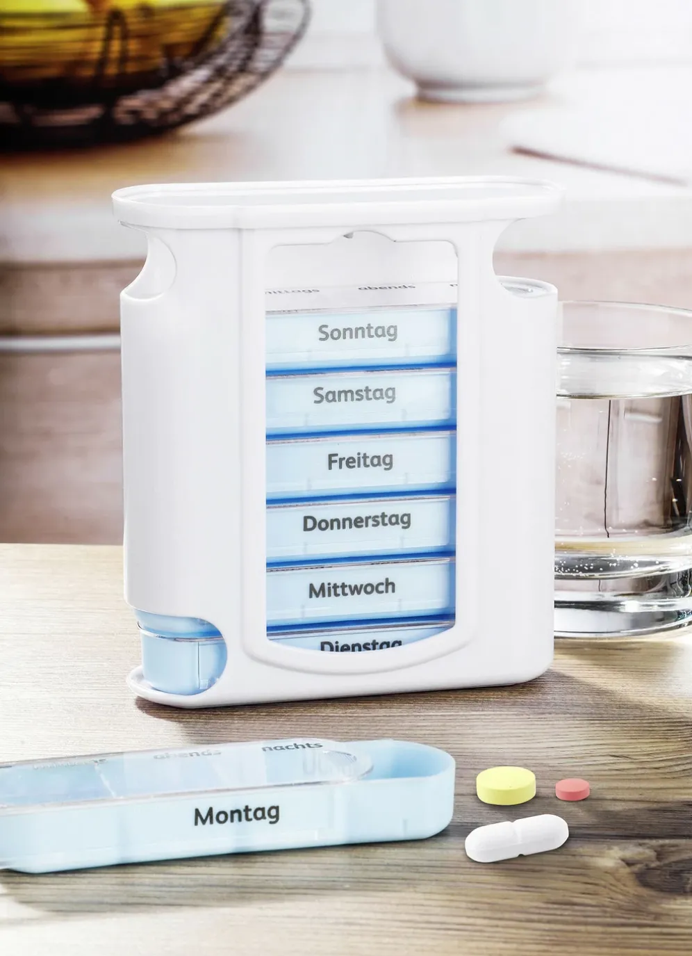 Die übersichtliche und sichere Hilfe für alle Menschen, die regelmäßig mehrmals täglich Arzneimittel einnehmen. Die Tablettenbox ordnet die einzunehmenden Tabletten und Pillen nach Wochentagen und Tageszeit (morgens, mittags, abends, nachts) und sorgt so für Übersichtlichkeit. Ideal auch für unterwegs. Maße: H13xB11,5xT4 cm.