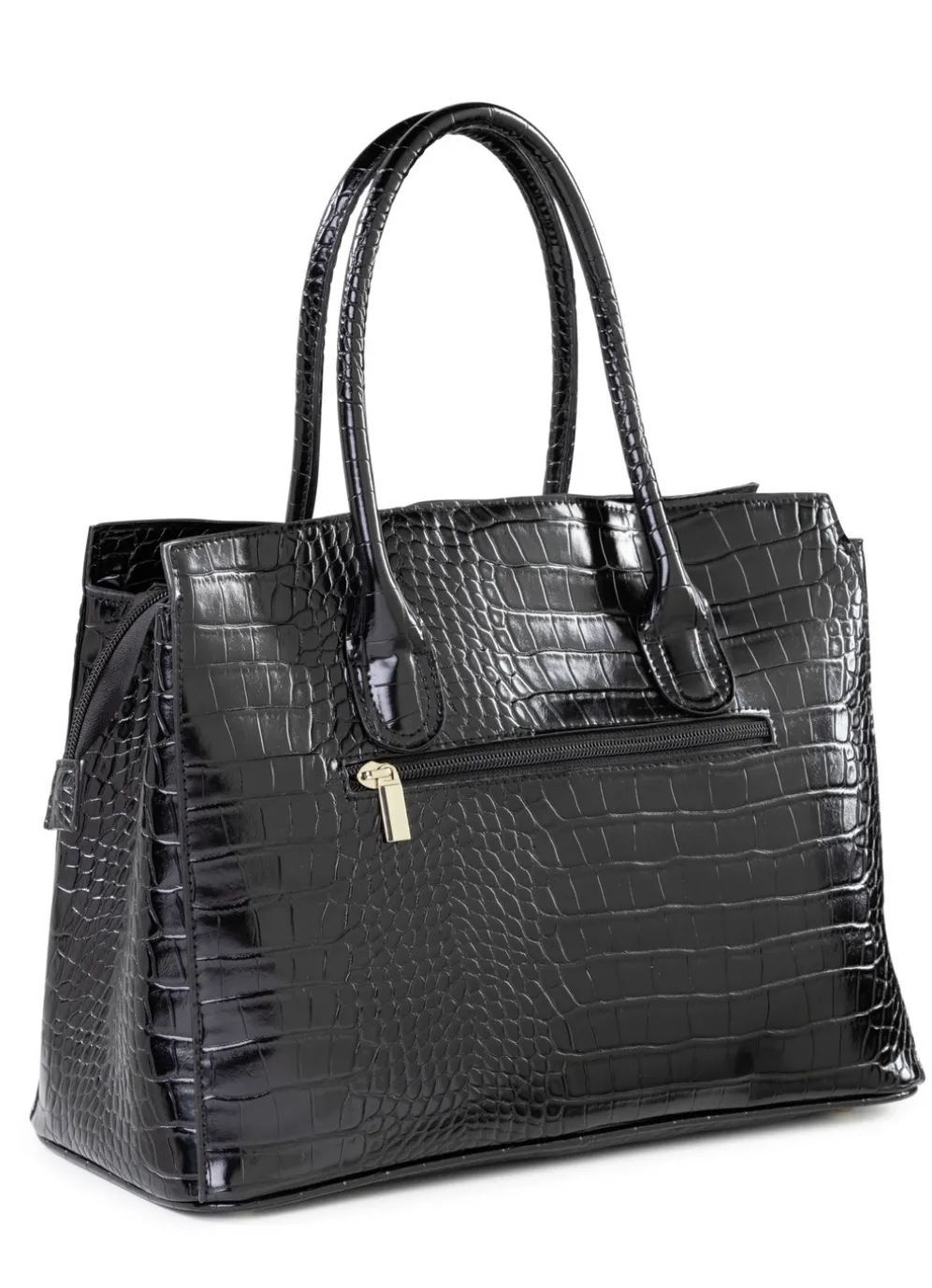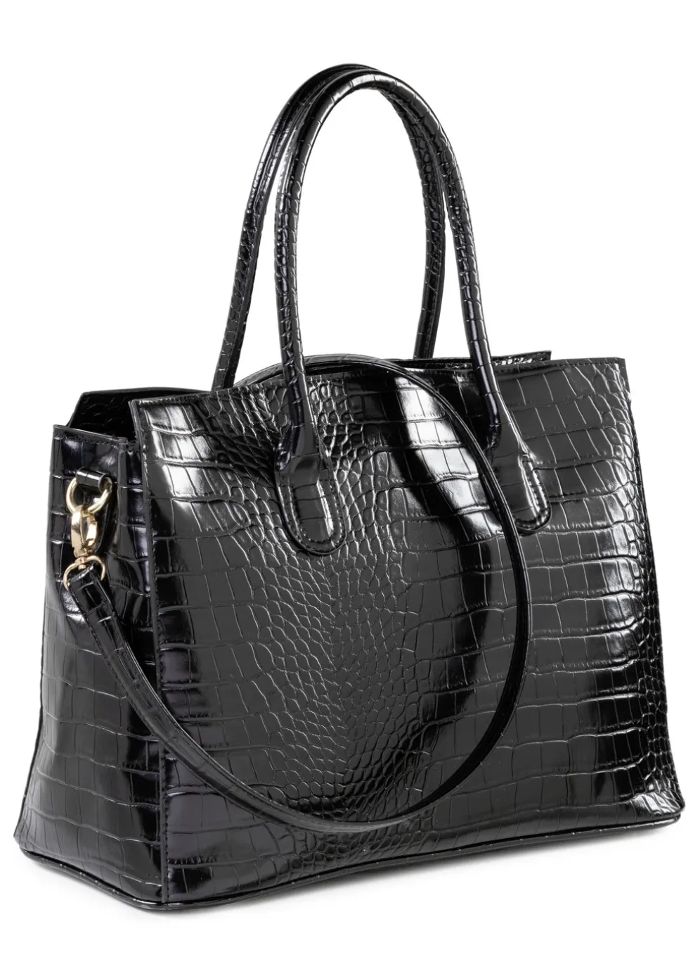 Tasche aus krokogeprägtem Synthetik in Schwarz.