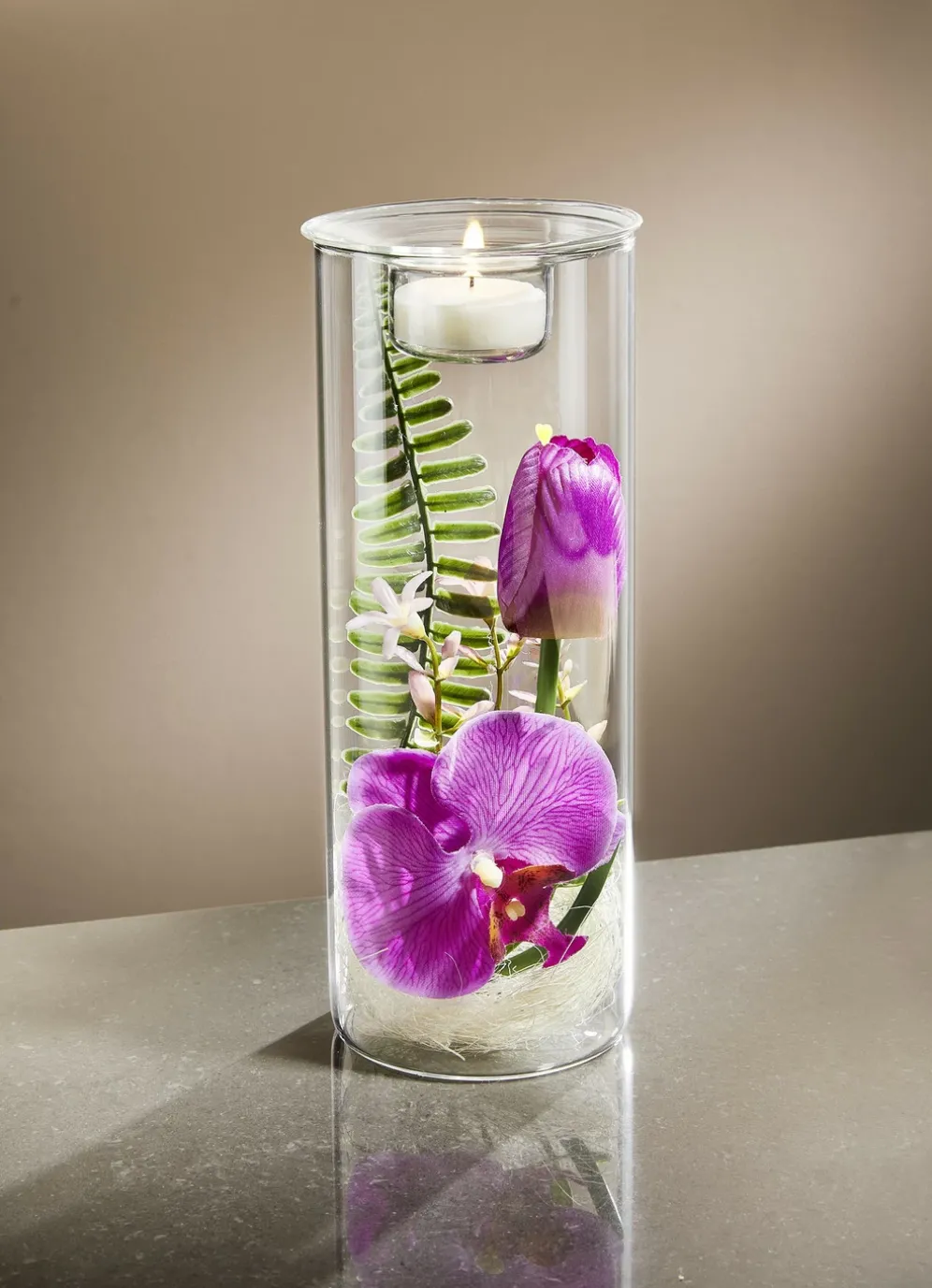 Dieser wunderschöne Teelichthalter in Zylinderform, wurde mit einer prächtigen, lilafarbenen Orchideenblüte und einer Tulpe, sowie grünem Beiwerk romantisch geschmückt. Aus hochwertigem Glas, sowie Kunst- und Textilmaterial hergestellt. Die Lieferung erfolgt ohne Teelicht.