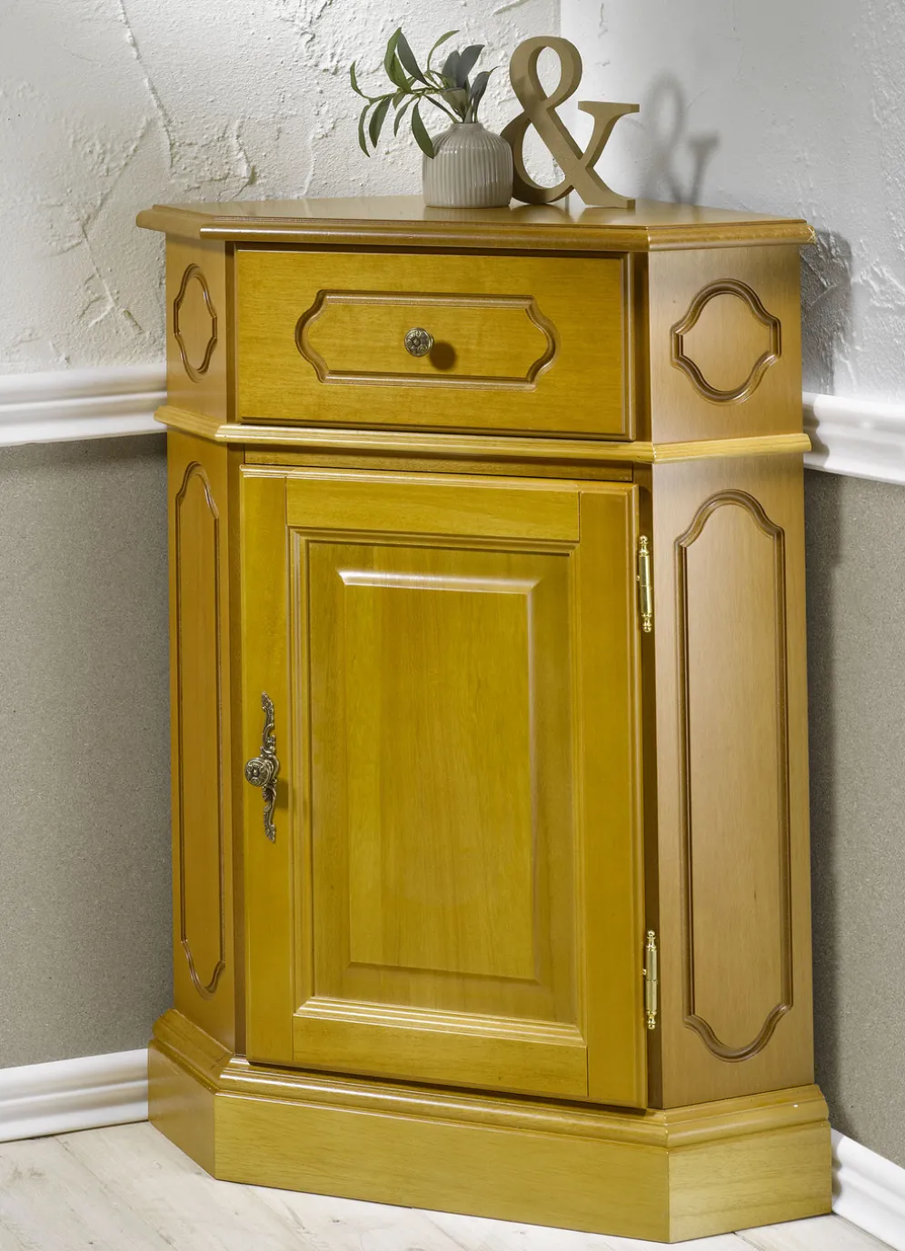 Eck-Kommode mit 1 Schublade, darunter 1 Tür, dahinter 1 Einlegeboden. Maße: B62xH82xT42 cm, Schenkellänge 44 cm