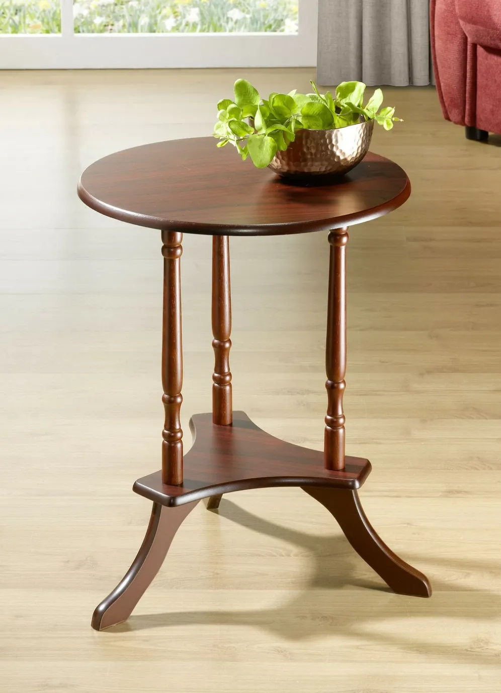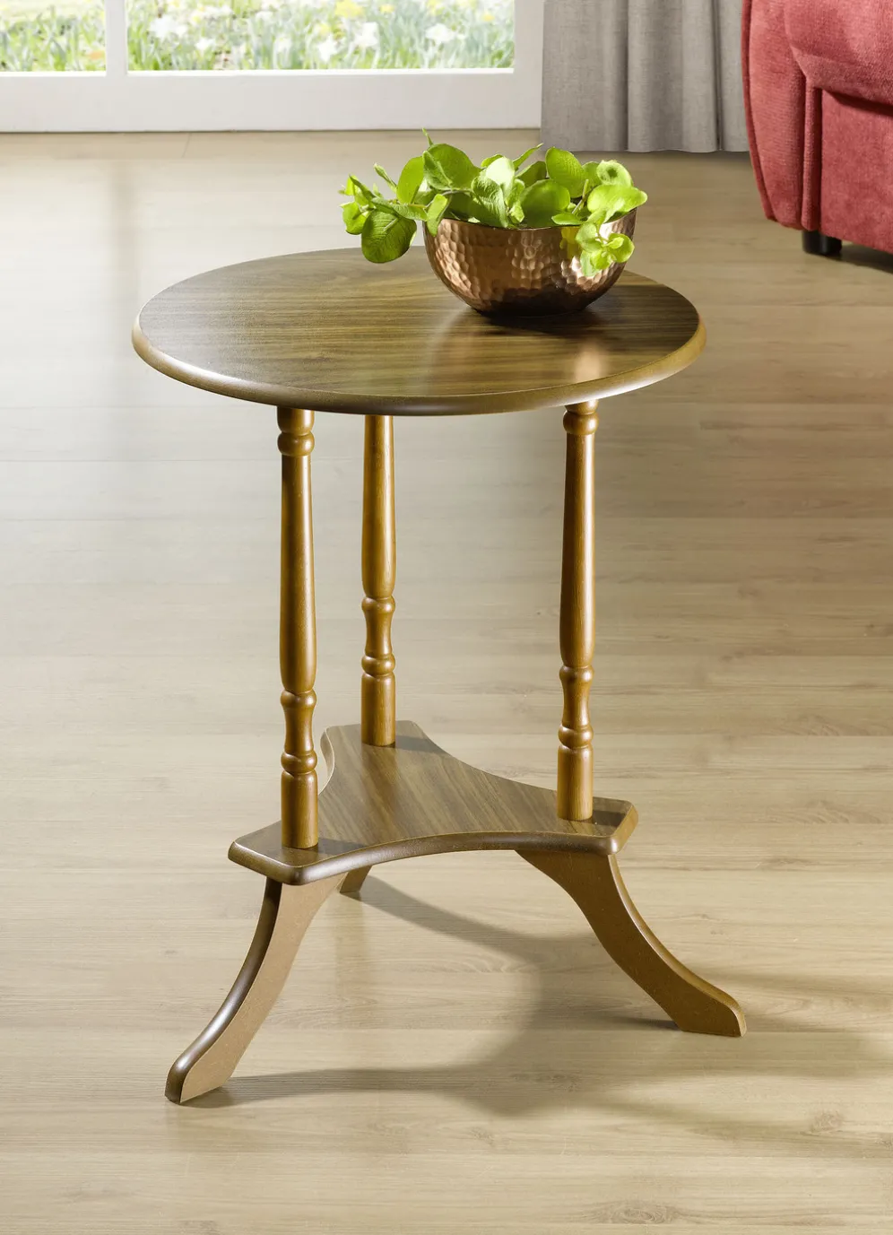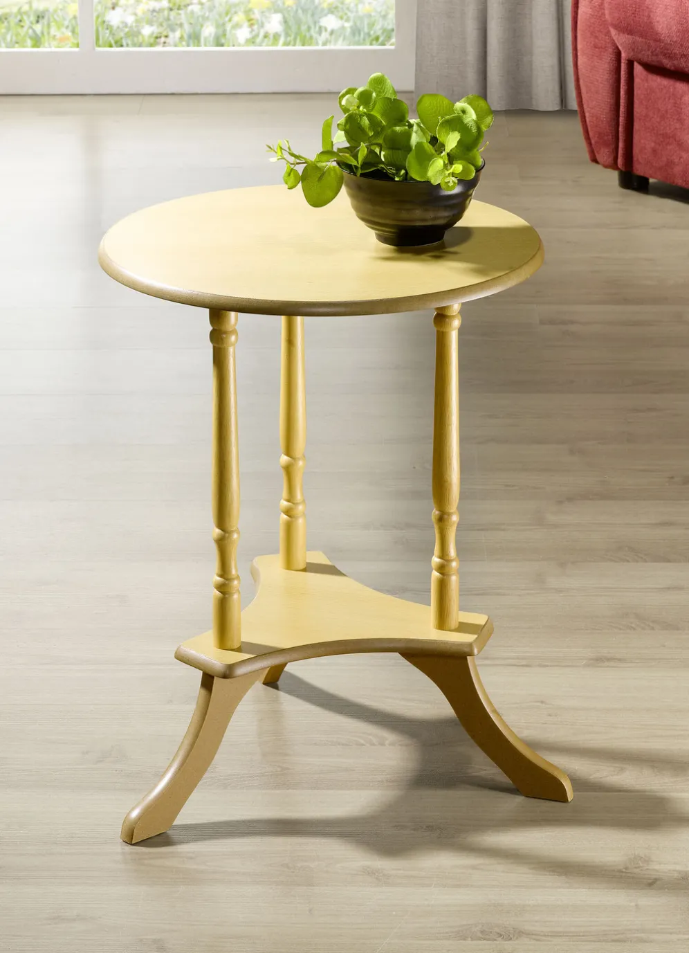 Raffinierter, teilmassiver Beistelltisch mit großer, runder Tischplatte, gedrechselten Beinen sowie praktischer zweiter Ablage unten. Maße: Höhe 51 cm, ø 40 cm. Mit Aufbau-Anleitung zur einfachen Selbstmontage.