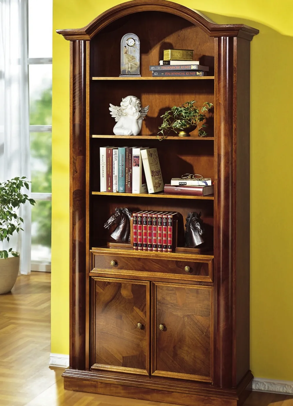 Bücherschrank: Mit formschönem Kranz, 1 festem Boden und 2 Einlegeböden, 1 Schubkasten sowie 2 Türen. Maße: B95,5xH192,5xT32,5 cm.