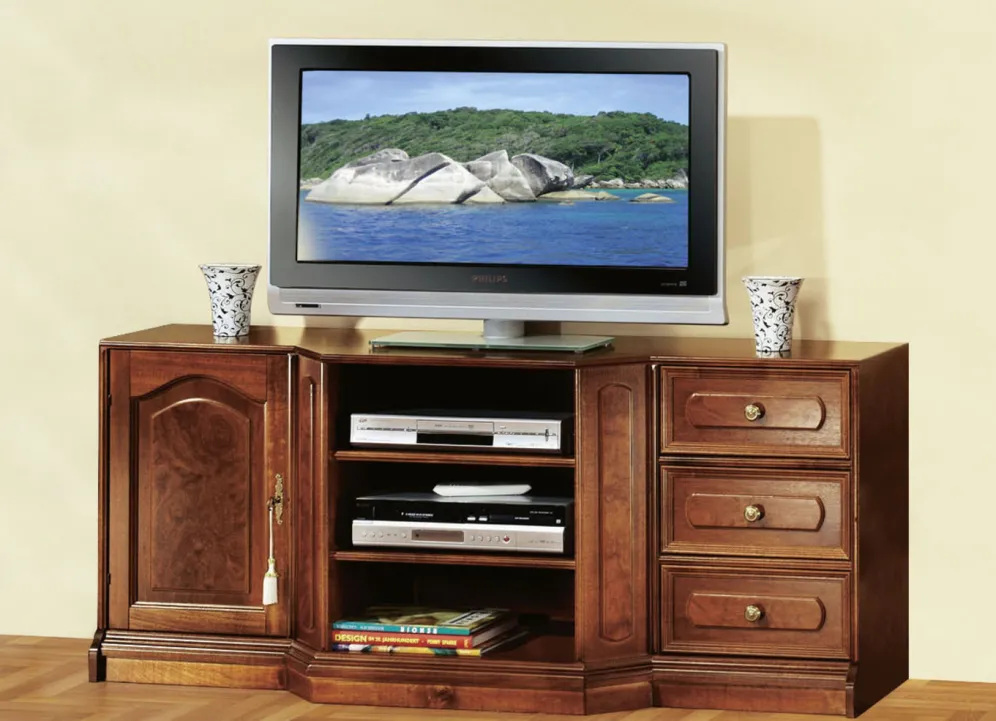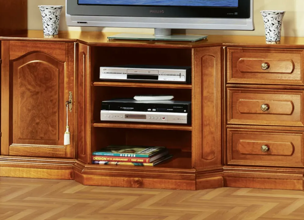 TV-Longboard mit Erker: Links 1 Tür, dahinter 1 fester Boden. In der Mitte Erker und 1 Fach (B50xH33xT38 cm) mit 2 festen Böden. Rechts 3 Schubladen. Die Maße: B157xH67xT42 cm