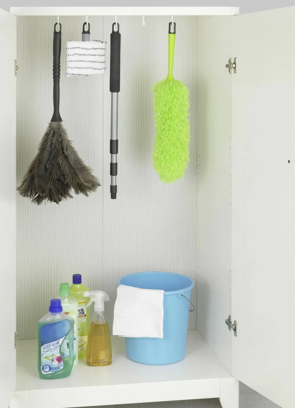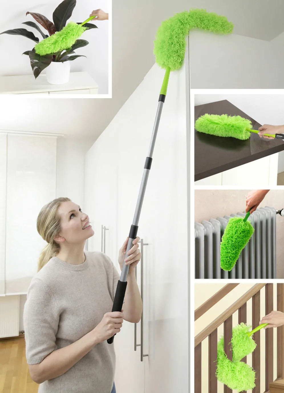 Teleskop-Staubwedel – ideal zum Staubwischen an schwer erreichbaren Stellen, wie z. B. hinter Heizkörpern, Staubweben an der Decke, hinter/auf Schränken uvm. Die statisch aufgeladenen Mikrofasern ziehen den Staub magisch an. Dank 90°-knickbarem Wedel flexibel einsetzbar und individuell formbar für schmale Zwischenräume und Nischen. Teleskopstange, ausziehbar von 110–175 cm. Bis zu ca. 4 Meter Arbeitshöhe für eine mühelose Reinigung bis in jeden Winkel. Ohne Stiel als praktischer Hand-Staubwedel verwendbar, ideal zum Abstauben von Stuhlbeinen, Treppengeländern uvm. 5 Jahre Herstellergarantie