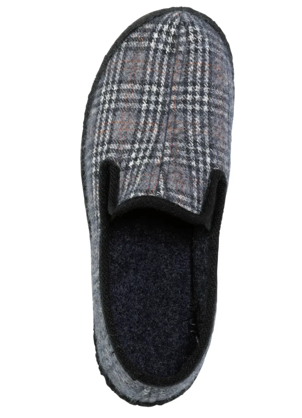 Karierter Textil-Hausschuh in Blaugrau-Multicolor: anatomisch geformtes Fußbett mit Fersenluftpolster, Filzschalensohle sowie TR-Laufsohle