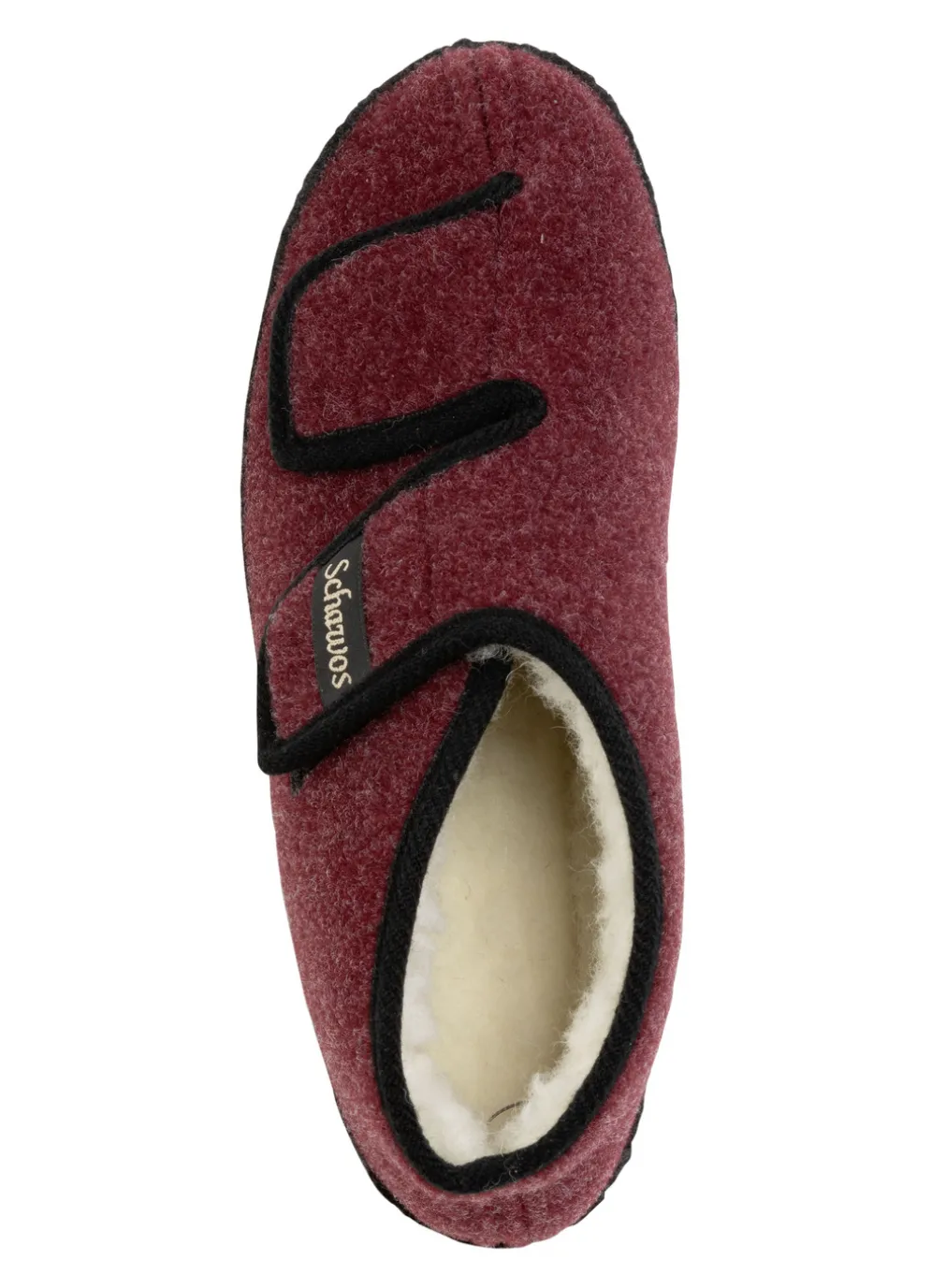 Atmungsaktive Textil-Stiefelette in Bordeaux-Schwarz, mit zwei praktischen Klettspangen: Warmfutter und Fußbettbezug aus 100% Schurwolle, Fersenluftpolster, Filzschalensohle, TR-Laufsohle, 25 mm Keilabsatz