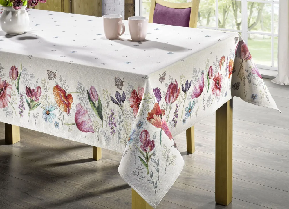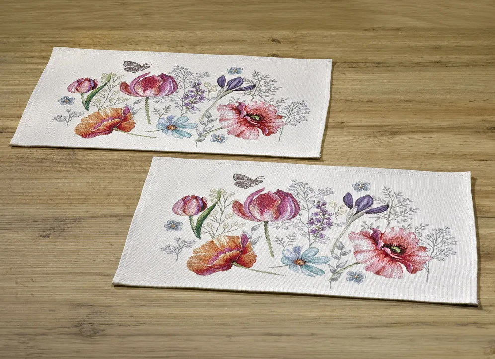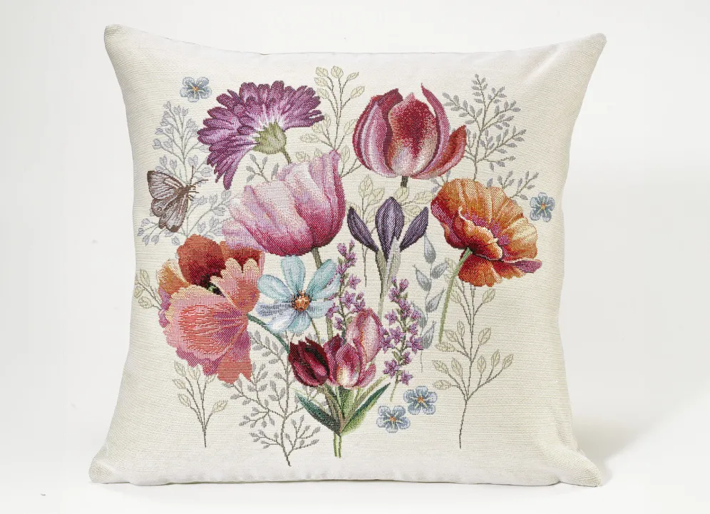 Mit einem farbenfrohen, floralen Dessin und kleinen Schmetterlingen möchte diese Tisch- und Raumdekoration Ihr Zuhause verschönern. Kissenbezug mit Reißverschluss gefertigt. Die Qualität: Gobelin aus 75% Polyester, 22% Baumwolle, 3% Polyacryl. Waschbar bis 30 °C.