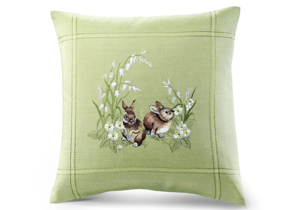 Süße Hasen hoppeln auf dieser attraktiven Tisch- und Raumdekoration zwischen Blüten und Gräsern und sind echte Hingucker für Sie und Ihre Gäste! Kissenbezug mit praktischem Reißverschluss.