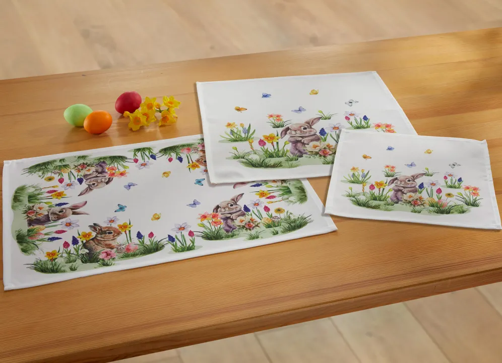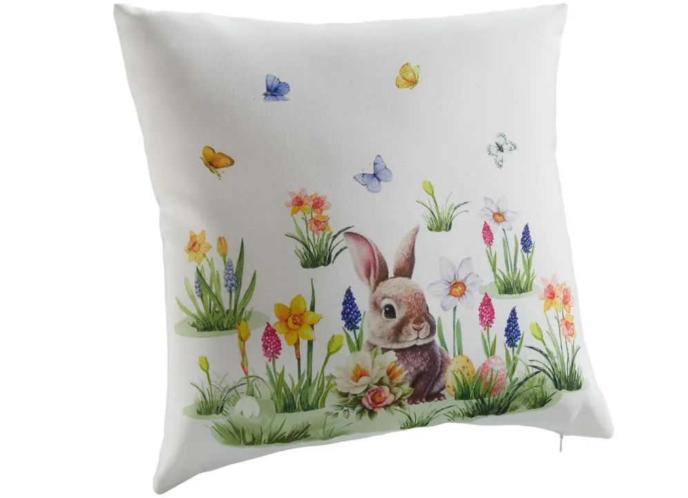 Die vielen Häschen, Schmetterlinge und Frühlingsblumen auf diesen bedruckten Wohnaccessoires werden das Highlight Ihrer Ostertafel sein. Kissenbezug mit praktischem Reißverschluss. Qualität: 100% Polyester. Waschbar bis 30 °C.