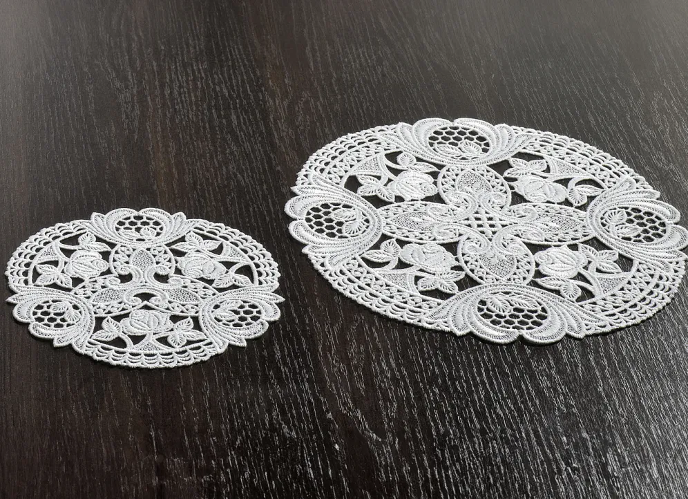 Tisch- und Raumdekoration aus echter Plauener Spitze in Größe 100 (Deckchen rund – Vollspitze, ø 20 cm) und in Weiss.