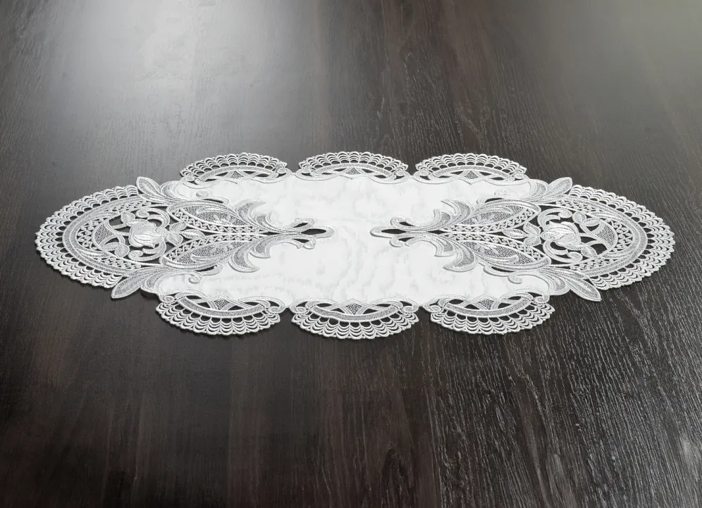 Diese stilvolle, hochwertige Tisch- und Raumdekoration aus echter Plauener Spitze mit filigran gearbeiteten Rosen wird Ihren Wohnbereich verzaubern. Wahlweise aus Vollspitze oder mit klassischem Stoffeinsatz. Die Qualität: 100% Polyester. Waschbar bis 30 °C.