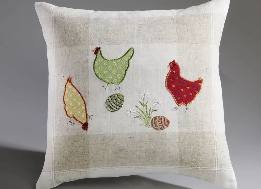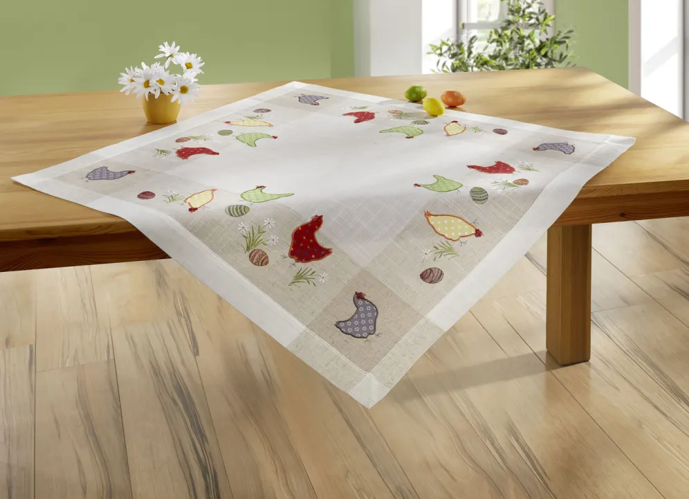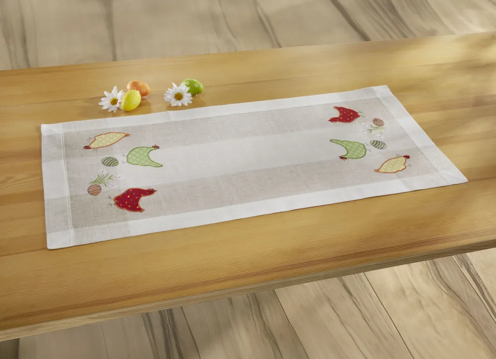 Diese tolle Tisch- und Raumdekoration zeigt lustige Hühner und bunte Ostereier. Besonders schön sind die aufwendigen Applikationen, die in Kombination mit der Stickerei ein absoluter Hingucker sind. Kissenbezug mit Reißverschluss. Die Qualität: 100% Polyester. Waschbar bis 40 °C