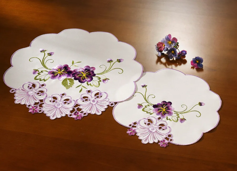 Tisch- und Raumdekoration mit Blüten in Spitzen-Optik in Größe 300 (2 Deckchen rund, ø 30 cm) und in Sekt.