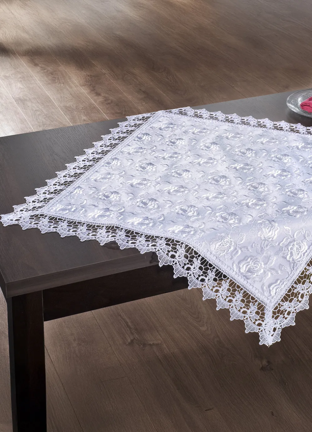 Tisch- und Raumdekoration mit Macramé-Spitzenbordüre in Größe 101 (Läufer, 40x 90 cm) und in Weiss.