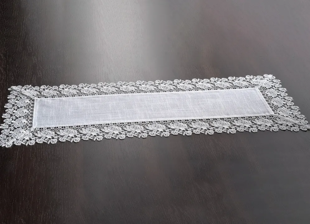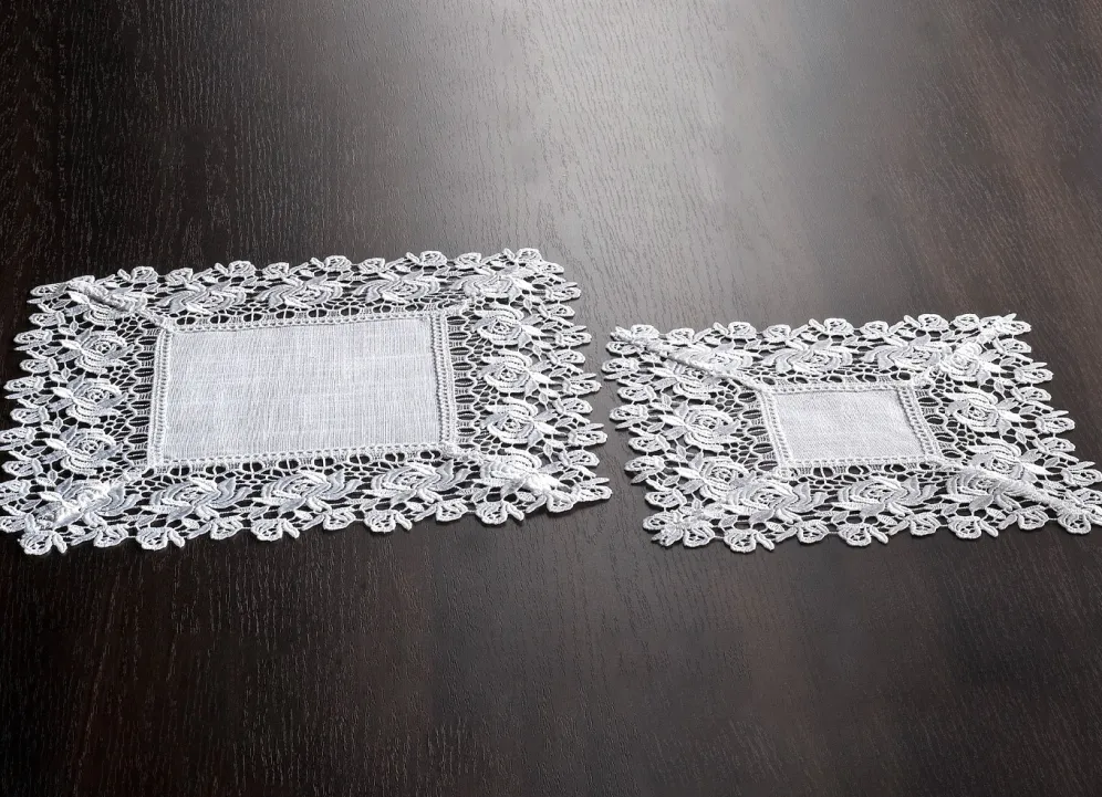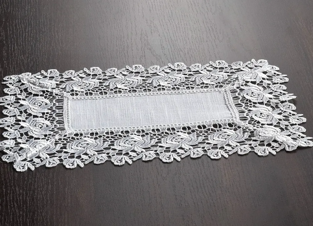 Tisch- und Raumdekoration mit Spitzenborte in Größe 101 (Deckchen, 35x 50 cm) und in Sekt.