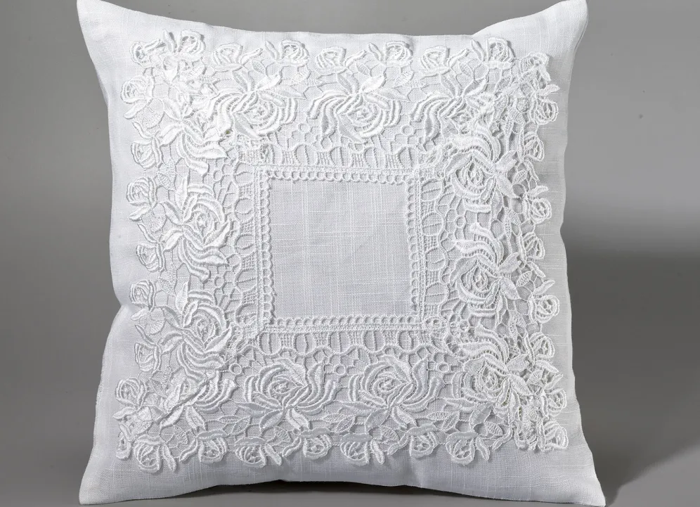 Diese aufwendig bestickten Accessoires mit hochwertiger Spitzenborte verleihen Ihrem Wohnraum pure Eleganz. Kissenbezug mit Reißverschluss. Qualität: 100% Polyester. Waschbar bis 30 °C.