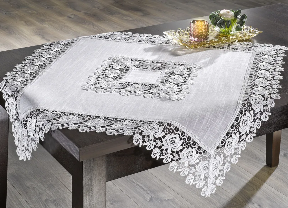 | Size | 101 (Deckchen, 35x 50 cm), 102 (Läufer, 40x 85 cm), 103 (Läufer, 40×110 cm), 185 (Tischdecke, 85x 85 cm), 190 (Tischdecke, 110×110 cm), 300 (2 Deckchen, 30x 30 cm), 301 (2 Deckchen, 40x 40 cm), 404 (Kissenbezug, 40x 40 cm) |