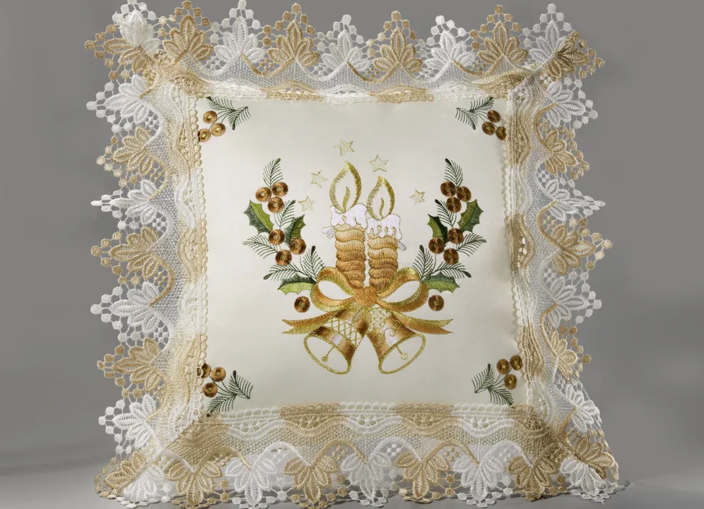 Mit wunderbar weihnachtlichen Kerzenmotiven und herrlich gearbeiteter Spitzenborte zeigt sich diese hübsch bestickte Tisch- und Raumdekoration. Der Kissenbezug ist mit Reißverschluss ausgestattet. Die Qualität: 100% Polyester. Waschbar bis 30 °C